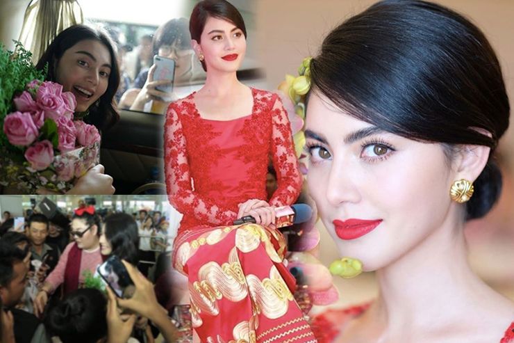 “ใหม่ ดาวิกา” สวยสะพรึง! นุ่งลองยีสีแดงสด บินร่วมงานอีเว้นท์ที่พม่า แฟนคลับแห่ต้อนรับเเน่น