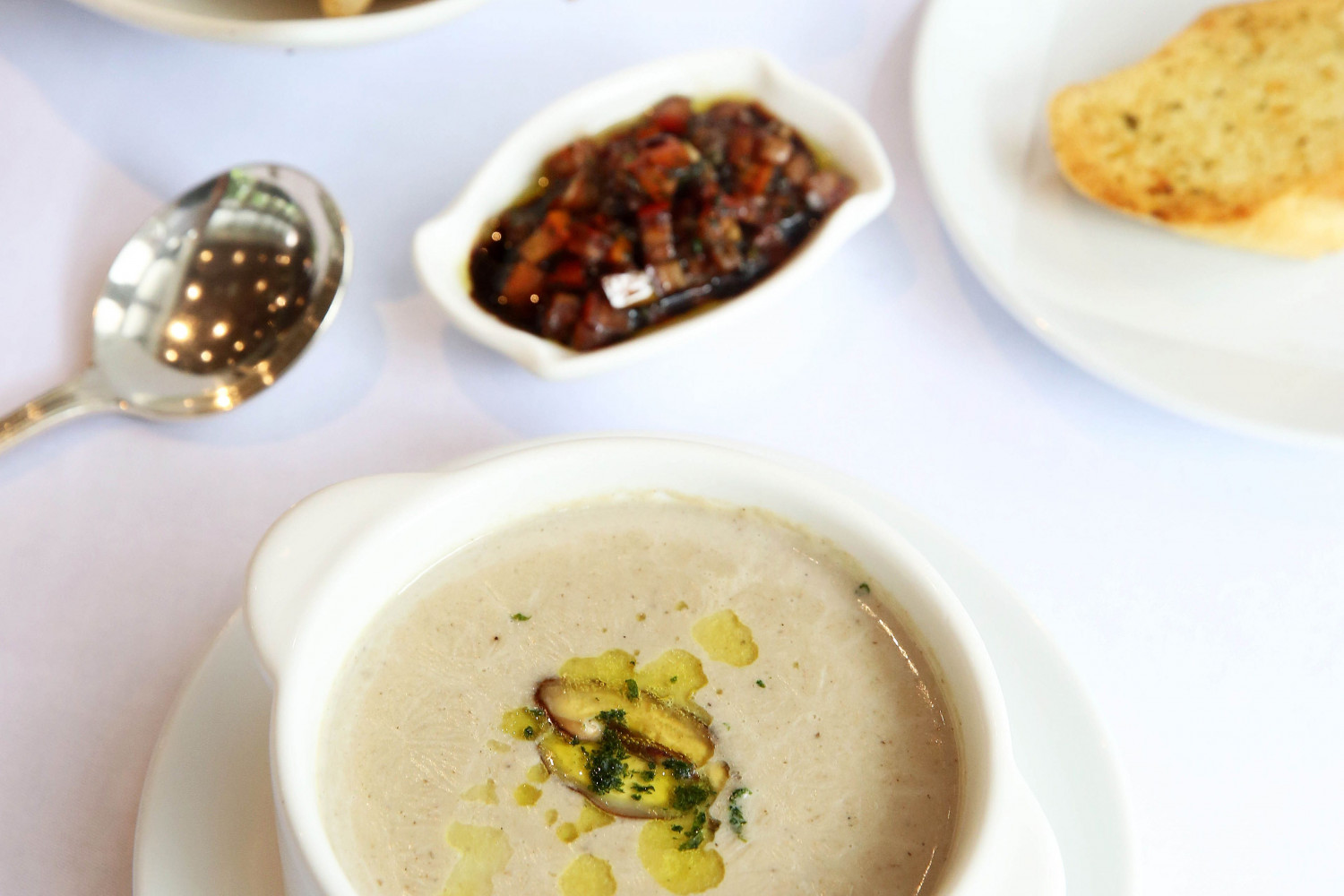 สำหรับเมนูเด็ดที่ภูมิใจนำเสนอในวันนี้ คือ 6 รายการเป็นเซตพิเศษที่จะเป็นโปรโมชั่นของเดือน ต.ค.คือ สลัดอกเป็ดรมควันเสิร์ฟพร้อมซอสราสพ์เบอร์รี่ เนื้อเป็ดเนียนนุ่มหอมกรุ่นชุ่มซอสสีแดงมาคู่กับผักสลัดสดกรอบพร้อมซอสรสเปรี้ยวนิดหวานหน่อย ตามด้วยซุปเห็ดทรัฟเฟิล รสชาติเข้มข้นนวลเนียนมีกลิ่นหอมของเห็ดทรัฟเฟิล พร้อมเนื้อเห็ดเพิ่มสัมผัสลิ้นเวลาเคี้ยวหนึบๆ ต่อด้วยจานที่ 3 คือ หอยเชลล์อบมอซซาเรลล่าชีส หอยตัวใหญ่หนาเนื้อแน่นเต็มปากเต็มคำราดซอสครีมหอมหวานมัน