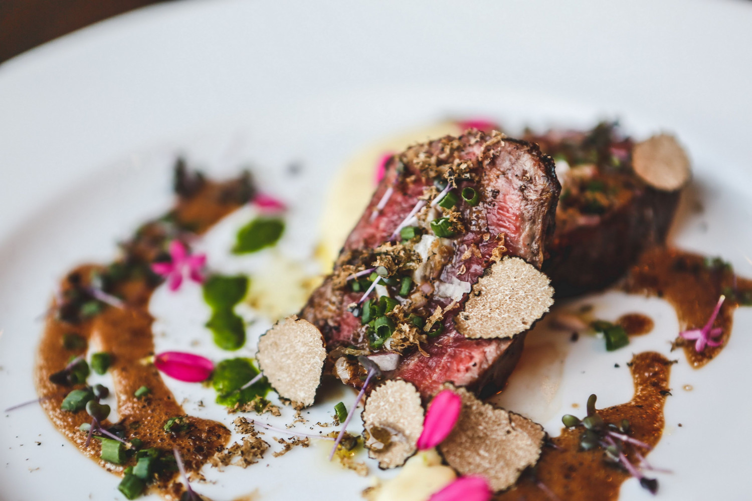 Tournedos Rossini เนื้อเทนเดอร์ลอยน์จากออสเตรเลียและฟัวกราส์ มันฝรั่ง มะเขือเทศเฮอริเทจ ราดด้วยซอสทรัฟเฟิล หรือ Slow cooked Lamb Tenderloin แกะเทนเดอร์ลอยน์ปรุงแบบสโลว์คุก คลุกเคล้าสมุนไพร เสิร์ฟกับผักไมโครกรีน ราดซอสทรัฟเฟิล