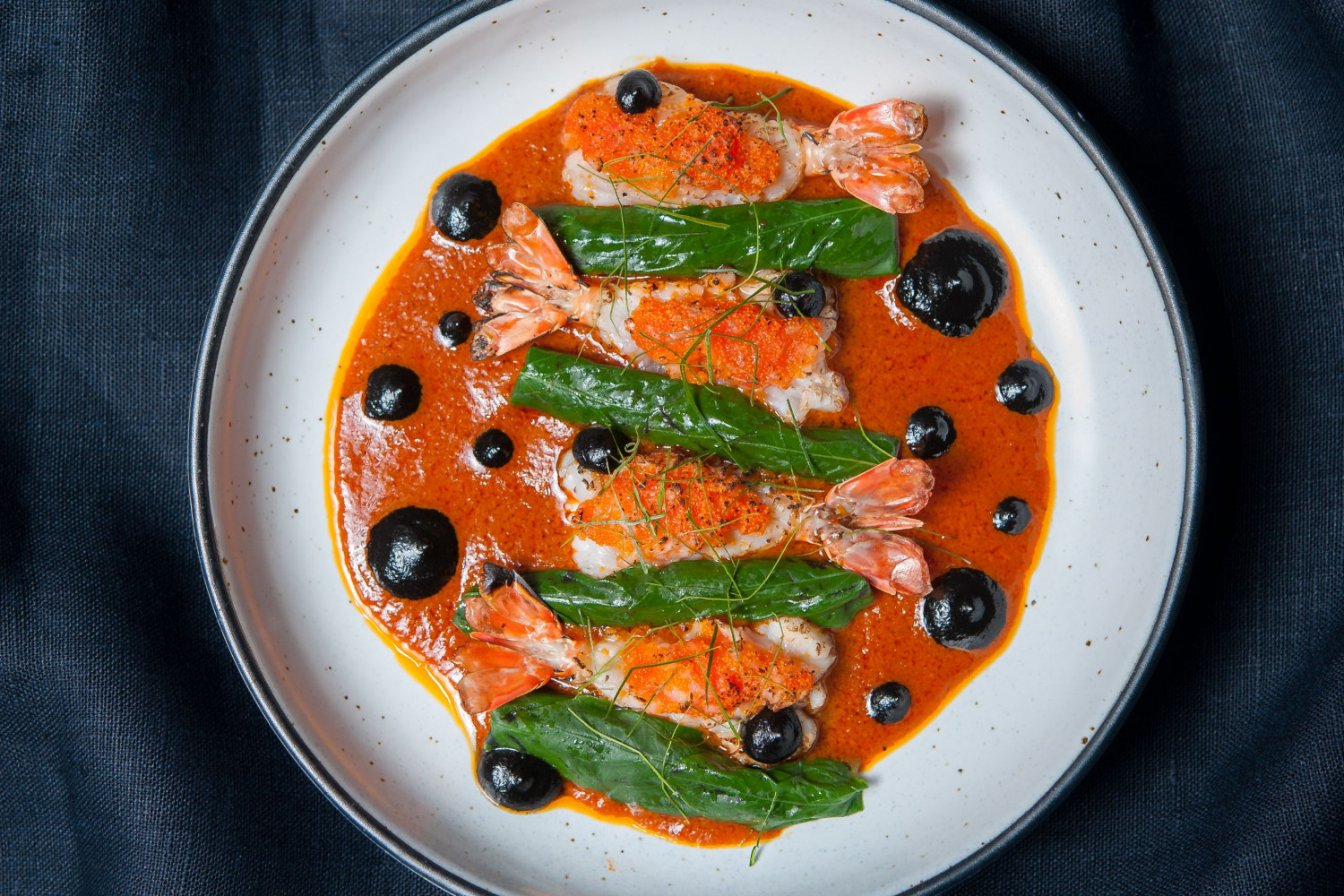 เมนูต่อมา พล่ากุ้งก้ามกรามย่าง กุ้งน้ำกร่อยจากระนองมาย่างถ่าน แล้วทำพล่ากับน้ำพริกเผาทำเอง เสิร์ฟกับไขกระดูกวัวน้ำปลาทอดกรอบ ข้างล่างเป็นคางกุ้งกรอบ โรยด้วยตะไคร้ทอดกรอบ กับกุ้งแห้ง ได้ความกรอบมันของไขกระดูกและคางกุ้งทอดกรอบ