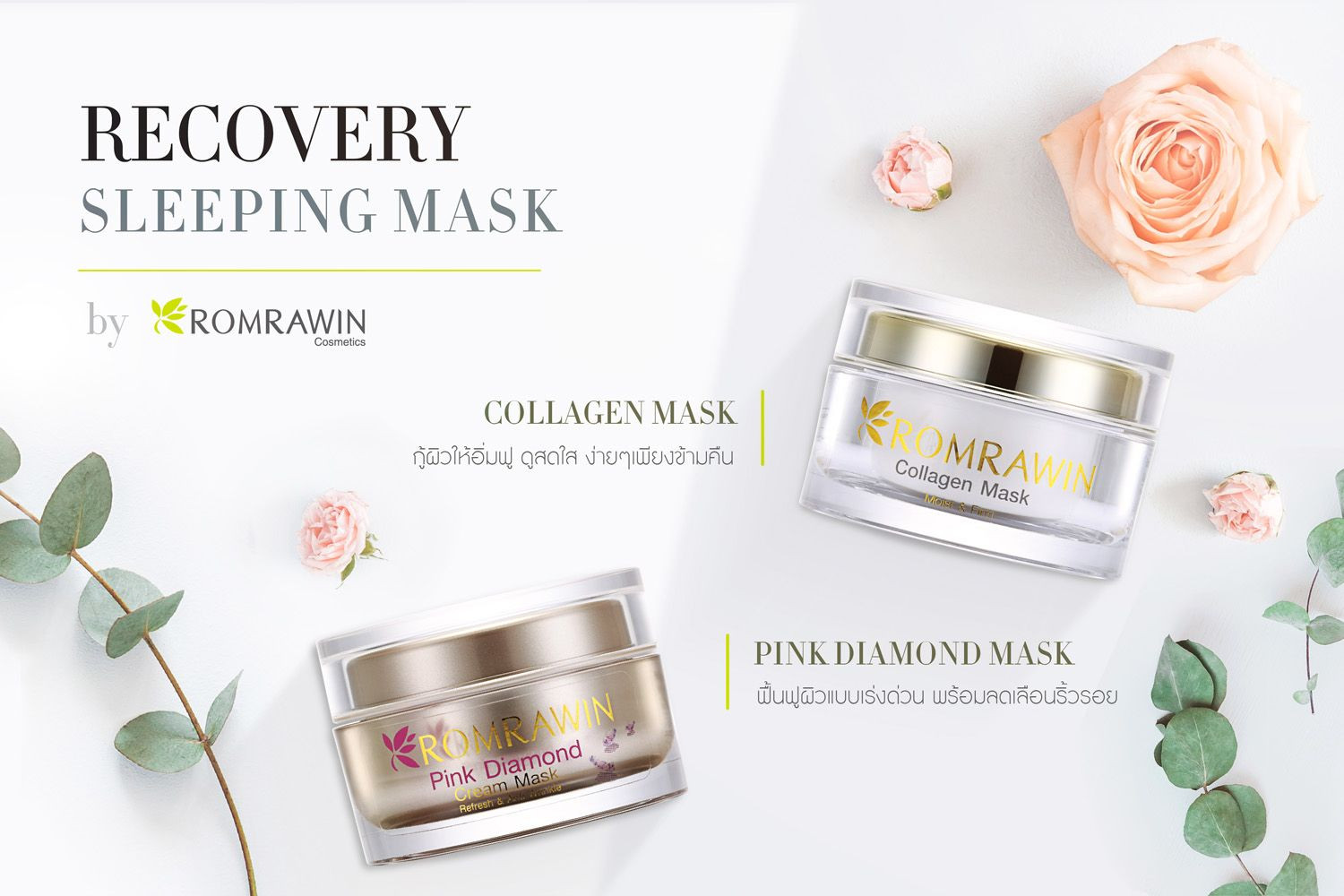 อยากแนะนำ Sleeping Mask ที่โดดเด่นมากในเรื่องกู้ผิวสวยในข้ามคืน จาก Romrawin Cosmetics นั่นคือ Collagen Mask และ Pink Diamond Mask ซึ่ง Collagen Mask มีส่วนช่วยกระตุ้นการสร้างคอลลาเจนในชั้นผิว ด้วยส่วนผสมคอลลาเจนที่มีโครงสร้างเหมือนคอลลาเจนในชั้นหนังแท้ (Dermis) ดีมากสำหรับสาวๆคนไหนที่นอนน้อยๆ ใช้ Collagen Mask ตัวนี้ แล้วรับรองว่ากู้ผิวกลับมาสดใส ดูอิ่มฟู ได้เพียงชั่วข้ามคืนเลยค่ะ โดยอาจใช้วันเว้นวัน หรือใช้ทุกวัน หากเป็นช่วงที่ผิวอ่อนล้าจากปัจจัยต่างๆค่ะ