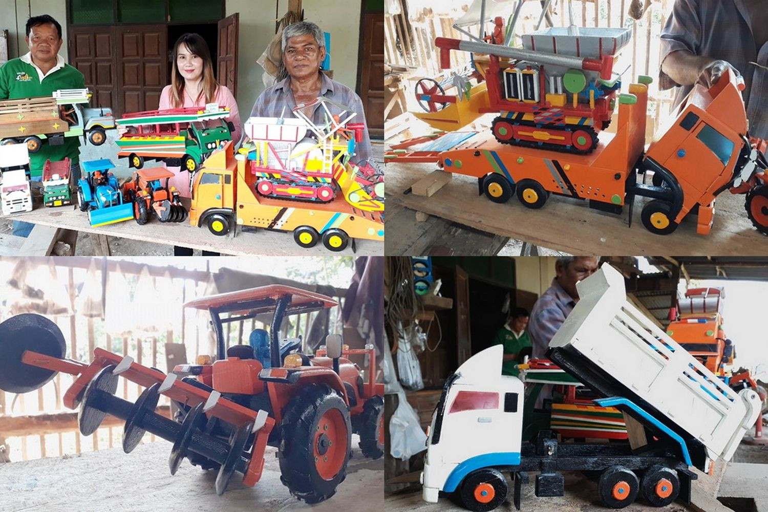 รถที่ประดิษฐ์จากไม้สัก มีทั้งรถไถนา รถบรรทุกสิบล้อ รถโดยสารแบบคอกหมู รถเกี่ยวข้าว รถแบคโฮ และรถชนิดอื่นๆ ตามสั่งทำได้หมด ราคาขายตั้งแต่ 500-2,500 บาท ขึ้นอยู่กับขนาด ความยากง่ายเพราะใช้เวลาทำหลายวัน เช่น รถคอกหมูใช้เวลาทำ 2 วัน ส่วนรถเกี่ยวข้าวพร้อมรถเทรลเลอร์บรรทุก นั้นทำนานถึง 7 วันงานจึงเสร็จ