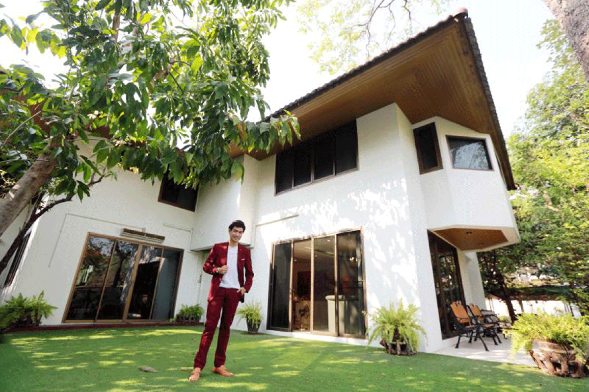 ตัวบ้านที่เขาอาศัยเป็นบ้านสองชั้นครึ่ง สร้างขึ้นใหม่ในรั้วเดียวกันตอนอายุ 20 กว่า โดยได้ลงมือออกแบบเค้าโครงทั้งหมดด้วยตัวเอง “ดราฟต์แรกของบ้านหลังนี้ผมเป็นเขียนเองว่า ต้องการหันห้องนอนไปทางทิศตะวันออก ต้องการให้ห้องนอนอยู่ห่างจากประตูใหญ่ที่ติดถนนให้มากที่สุด เพื่อป้องกันเสียงรบกวน ส่วนชั้นล่างเมื่อเปิดประตูหลักเข้ามาจะเจอกับห้องรับแขก โดยแยกส่วนกับห้องรับประทานอาหาร และยังมีห้องสันทนาการ ซึ่งทั้งหมดผมเป็นคนเขียนแบบแรกเองร้อยเปอร์เซ็นต์ จากนั้นค่อยนำไปต่อยอดและใส่รายละเอียดด้วยมือสถาปนิก”