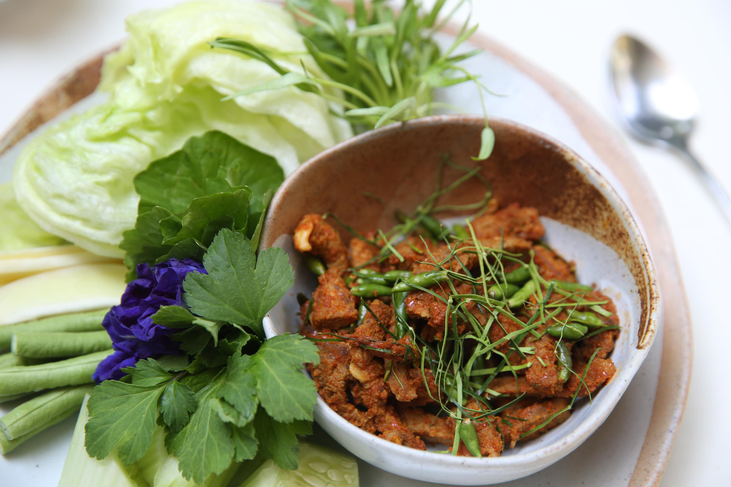 เมนูแนะนำที่ไม่ควรพลาด จานแรกแน่นอนว่าต้องเป็นคั่วกลิ้งจานเด็ดตามชื่อร้าน ที่ทางร้านเพิ่มทีเด็ดด้วยการใช้เนื้อริบอายจากออสเตรเลีย คลุกเคล้ากับเครื่องแกงรสเผ็ดร้อนที่โขลกแบบวันต่อวัน เรื่องรสชาติไม่ต้องพูดถึงอร่อยสมเป็นชื่อร้านจริงๆ และยิ่งเสริมทัพความอร่อยด้วยผักแนมสดๆ รสหวานกรอบ ที่ทางร้านปลูกเองแบบปลอดสารพิษ กินคู่กันรับรองว่าเลิศ
