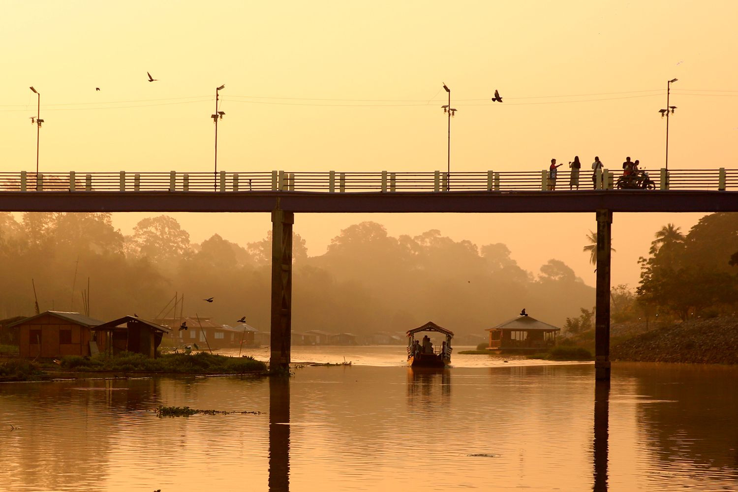เสียงนกดังแทนเสียงไก่ คุ้งน้ำสะแกกรังกำลังอุทัย พระอาทิตย์ใกล้โผล่พ้นต้นปาล์ม