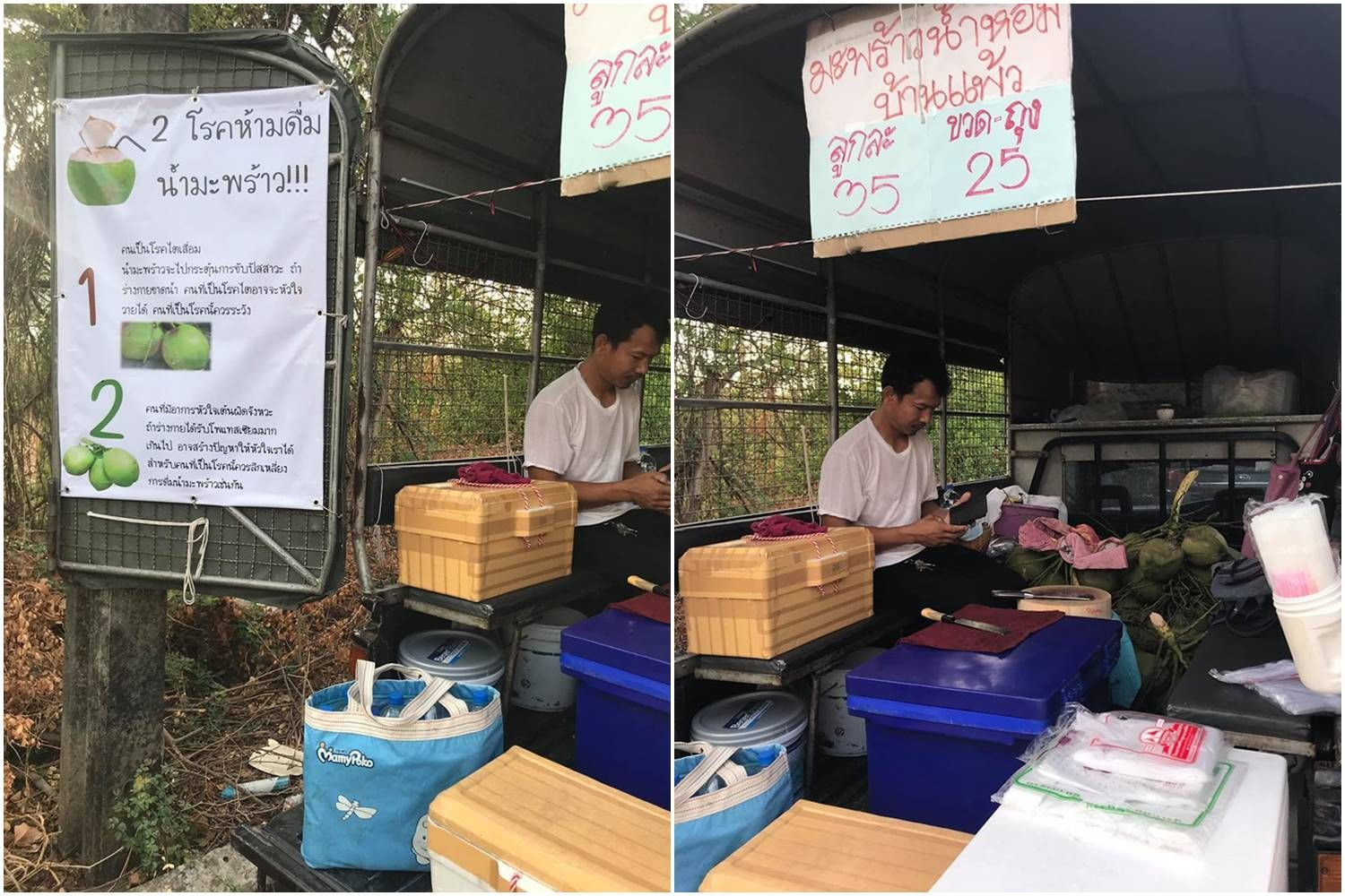 อดีตสมาชิกสภานิติบัญญัติแห่งชาติ เผยเรื่องราวอันน่าชื่นชมของพ่อค้ามะพร้าวที่ติดป้ายเตือนถึงผู้ที่เป็น 2 โรคห้ามดื่มน้ำมะพร้าว