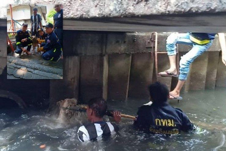 สุนัขชราตาบอดพลัดตกคลองระบายน้ำ เจ้าหน้าที่ดับเพลิงปากคลองสานลุยน้ำมุดเข้าท่อระบายน้ำใช้เชือกคล้องตัวก่อนน้ำท่วมมิดได้สำเร็จ