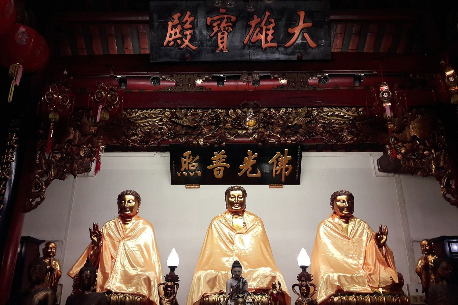 แม้จะมีขนาดย่อม แต่มีสิ่งที่น่าชมมาก คือ พระประธานทั้ง 3 คือ พระศากยมุนีพุทธเจ้าตรงกลาง ทางขวาของพระศากยมุนีคือพระอมิตาภะพุทธเจ้า และทางซ้ายของพระศากยมุนีคือ พระไภษัชยะคุรุพุทธเจ้า เป็นพุทธเจ้าทั้ง 3 ตามคติมหายาน เป็นพุทธปฏิมาแบบจีนรุ่นเก่าสมัยราชวงศ์ชิงที่หาชมได้ยาก
