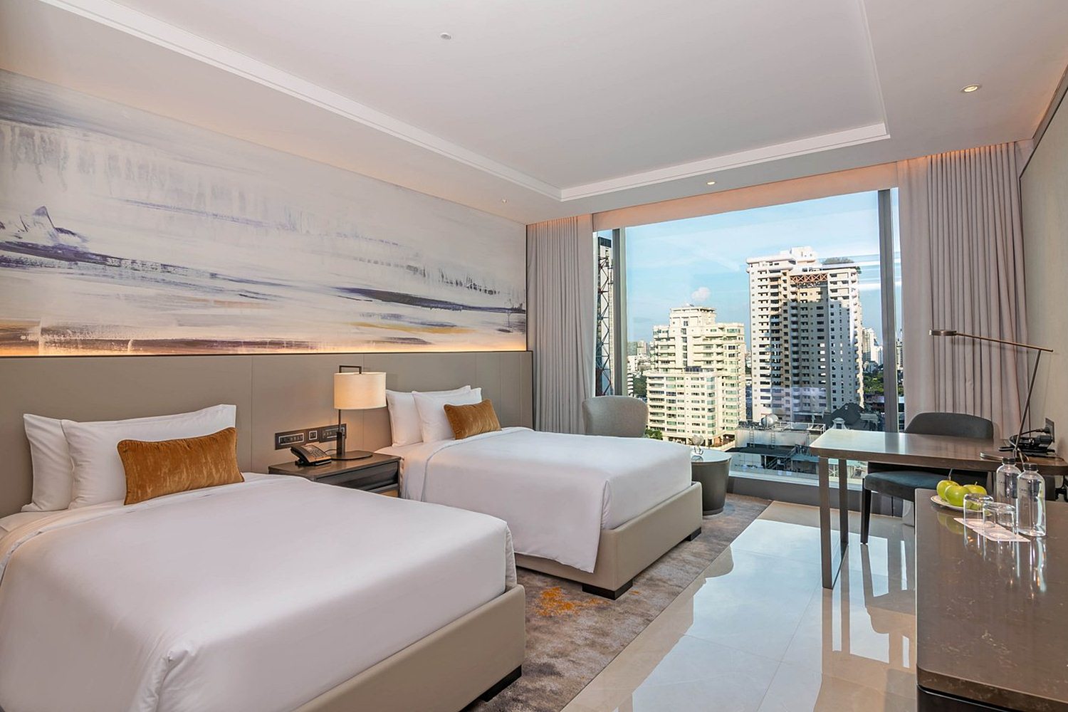 นอกจากนี้ ทางโรงแรมยังมีห้องพักและห้องสวีทขนาดกว้างขวางรวม 338 ห้องไว้บริการ เริ่มตั้งแต่พื้นที่ 37 ตารางเมตร ไปจนถึง 129 ตารางเมตร ห้องพักทุกห้องถูกออกแบบมาเป็นอย่างดี เพียบพร้อมด้วยสิ่งอำนวยความสะดวกอย่างครบครัน เพื่อการพักผ่อนอันแสนสบายของแขกผู้เข้าพัก กระจกหน้าต่างกันเสียงจากพื้นจรดเพดานพร้อมม่านทึบแสงและมูลี่ไฟฟ้า สมาร์ททีวีขนาด 49 นิ้ว ระบบ Mirror Chromecast ที่สามารถส่งคอนเทนต์ไปแสดงบนหน้าจอทีวี และเปิดหน้าจอสมาร์ทโฟนของ Apple TV ได้ เตียงเดี่ยวขนาดคิงไซส์ หรือเตียงคู่พร้อมที่นอนเกรดพรีเมียมของ Sealy Posturepedic ห้องน้ำแบบแยกโซนแห้งและห้องอาบน้ำแบบฝักบัว ตู้เสื้อผ้าขนาดใหญ่ โต๊ะทำงานพร้อมปลั๊กเชื่อมต่ออินเทอร์เน็ตแบบมีสายและไร้สาย ตู้เซฟอิเล็กทรอนิกส์และมินิบาร์ รวมถึงระบบควบคุมไฟฟ้าแสงสว่างที่ใช้เซ็นเซอร์ตรวจจับการเคลื่อนไหวเพื่อลดการใช้พลังงานกรณีที่แขกไม่อยู่ในห้องพัก และใช้เทคโนโลยี อินเทอร์เน็ตความเร็วสูงผ่านเครือข่ายบรอดแบนด์ที่ครอบคลุมอยู่ทั่วประเทศ ระบบ IPTV เพื่อให้แขกผู้เข้าพักสามารถใช้ค้นหาข้อมูล ทั้งในด้านความบันเทิงและการบริการของโรงแรมได้ผ่านระบบดิจิตอลแหล่งเดียวกัน