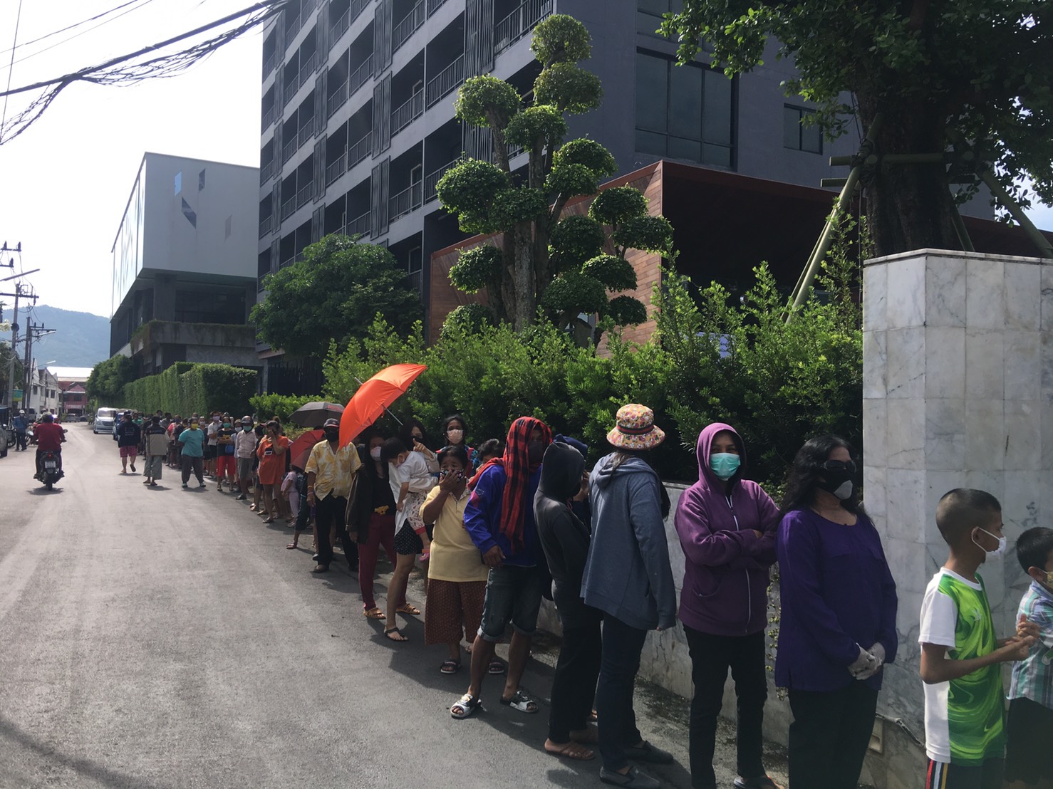 ที่ อ.หาดใหญ่ จ.สงขลา ประชาชนนับพันคนไปยืนต่อแถวยาวเหยียด หน้าโรงแรม ต้นอ้อย แกรนด์ ย่านคลองเตย เขตเทศบาลเมืองคอหงส์ เพื่อรอรับอาหารแจกฟรี ทางโรงแรมต้นอ้อยแกรนด์ ร่วมกับพันธมิตรทำมาแจกฟรี ช่วยบรรเทาความเดือดร้อนจากผลกระทบโควิด 19
