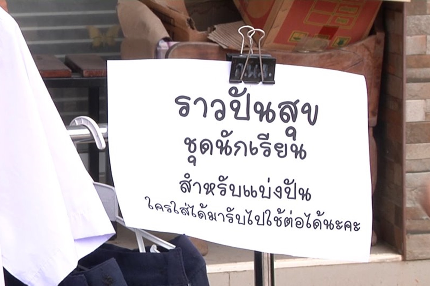 น.ส.ชุติมา แสนทวีสุข อายุ 46 ปี ที่บ้านพักเลขที่ 95/33 ซ.เหล่านาดี10 ถ เหล่านาดี อ.เมือง จ.ขอนแก่น โพสต์ข้อความผ่านเฟซบุ๊ก ชวนกันปันสุข ขอรับบริจาคชุดนักเรียนที่ไม่ใช้แล้วเพื่อนไปมอบให้กับนักเรียนในพื้นที่ห่างไกล ขณะที่หน้าบ้านของน.ส.ชุติมามีราวแขวนชุดนักเรียนตั้งอยู่และมีชุดนักเรียนแขวนไว้เพื่อให้ประชาชนทั่วไปมารับไปได้ฟรี
