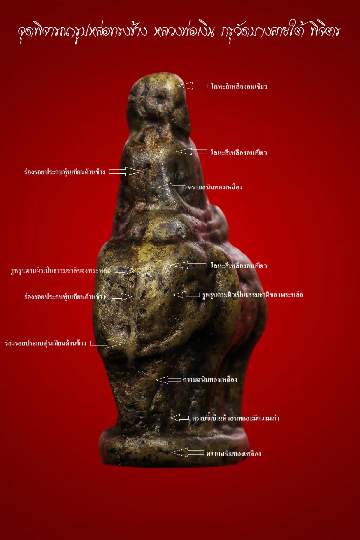 -พลิกส่องดูทั้งด้านหน้าและด้านหลังจะเห็นโลหะสีเหลืองอมเขียวที่แห้งและเก่าเสมอทั้งองค์