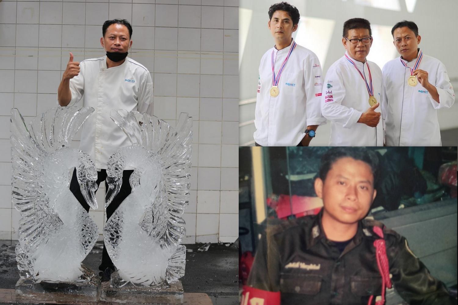 “ต้องขอบคุณเชฟรอย อึง หัวหน้าพ่อครัวใหญ่ เขาเป็นคนเปิดและให้โอกาส คือตอนนั้นหน้าที่รปภ.ทั่วไปดูแลความเรียบร้อยภาพรวมในอาคารที่มีงานแต่งงาน เลี้ยง ประชุม สัมมนา ก็ได้ไปเจอเชฟประกรณ์ กูลแก้ว เชฟสุพจน์ ศรีนวลจันทร์ กำลังแกะสลักน้ำแข็ง เราก็ตะลึงพรึ่งเพรือเลยเพราะทั้งชีวิตไม่เคยเห็นแบบนี้”