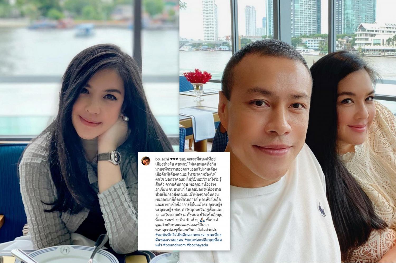 "ขอบคุณ ๆ พี่แบงค์ที่อยู่เคียงข้างโบ สุข ทุกข์ ไม่เคยทอดทิ้งกัน นาน ๆ ทีจะเรา 2 คนจะออกไปงานเลี้ยง เมื่อคืนพี่เลี้ยงคุณแม่โทร. มาตาม ร้องไห้ตกใจ บอกว่าคุณแม่ไม่รู้เป็นอะไร เกร็งไม่รู้สึกตัว ความดันตกวูบ พอลุกมาท้องร่วง อาเจียน จนขาดน้ำ โบเลยบอกให้น้องชายช่วยเรียกรถส่งคุณแม่เข้าห้องฉุกเฉินด่วน ผลออกมามีติดเชื้อในลำไส้ พอให้น้ำเกลือและยาฆ่าเชื้อก็อาการดีขึ้นแล้วค่ะ