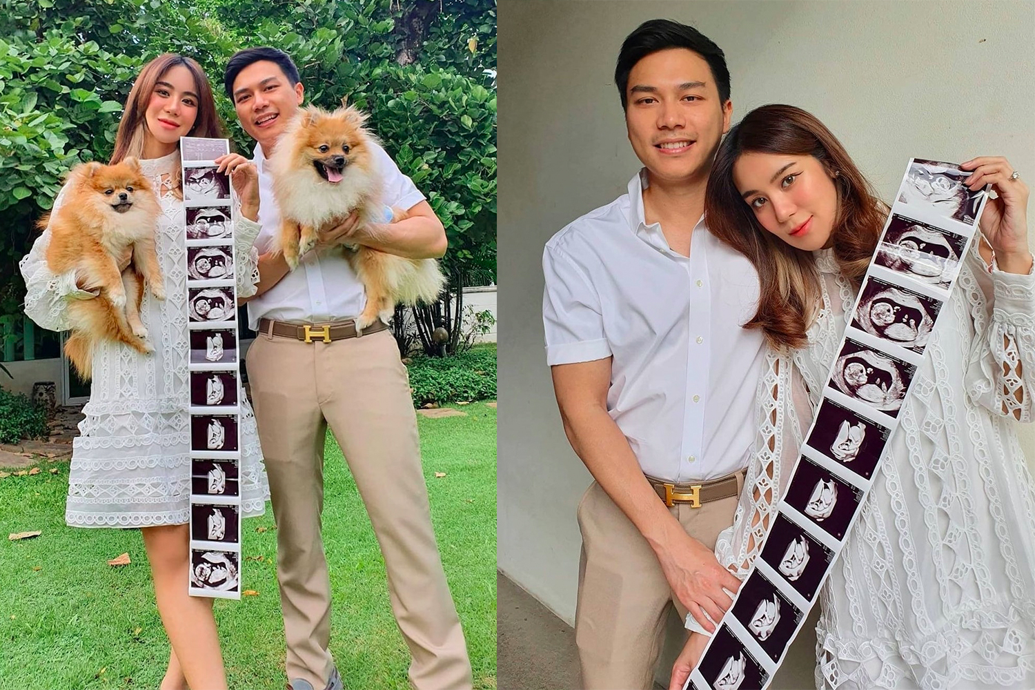 "Another happiest day of our lives @kensarasas mommy and daddy to be.... #13weekspregnant ตื่นเต้นสุด ๆ กันทั้งครอบครัวกับลูกคนแรกของเรา ในที่สุดก็สำเร็จค่าาาา น้องมาแล้วน้าาา ฝากเนื้อฝากตัวพี่ ๆ น้า ๆ อา ๆ ป้า ๆ ด้วยค่าาา ช่วงก่อนหน้านี้แพ้ท้องหนักมากอาจจะต้องปฏิเสธบางงานไปหรือไปทำงานแบบเพลีย ๆ แม่ต้องขออภัยด้วยนะคะ แต่ตอนนี้กลับมาฟิตแล้วค่า ไม่ค่อยแพ้แล้ว คืนนี้แม่หนมจะไปให้สัมภาษณ์ที่รายการ แฉ เรื่องเบบี๋เป็นที่แรก ใครอยากตื่นเต้นดีใจไปกับครอบครัวเรารอดูกันด้วยนะคะ” งานนี้ก็มีแฟนๆ และเพื่อนๆ เข้ามาร่วมแสดงความยินดีเป็นจำนวนมาก
