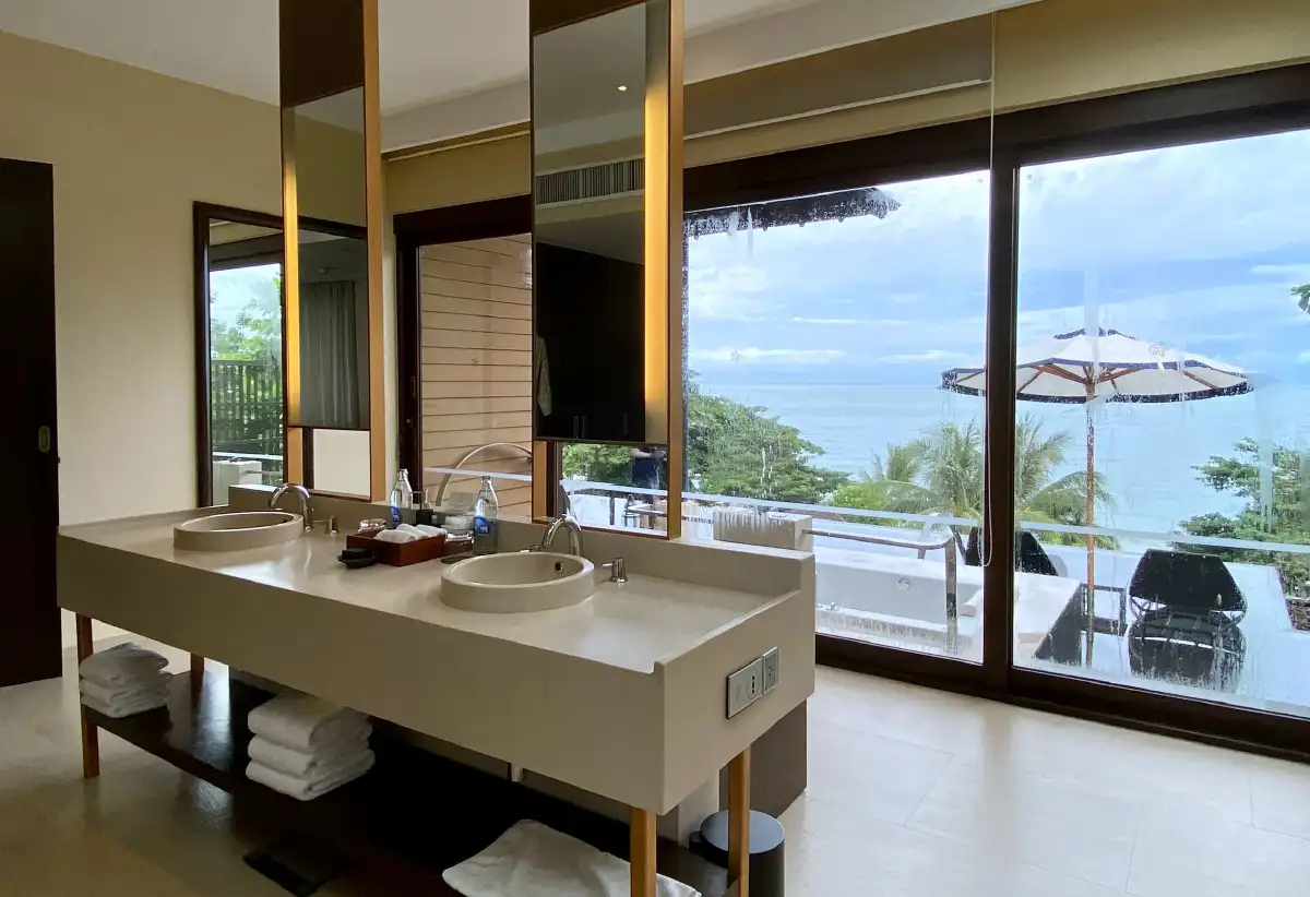 ประตูกระจกบานเลื่อนความสูงจรดเพดาน สร้างความรู้สึกโปร่งและอบอุ่น ด้วยแสงธรรมชาติที่สาดเข้ามาในห้องที่ตกแต่งด้วยโทนสีครีมและน้ำตาล ผสมผสานวิวทะเลสุดอลังการเข้ากับการตกแต่งภายในที่โดดเด่น เน้นรายละเอียดด้วยของประดับตกแต่งสีเงินทองวาววับและพื้นไม้ขัดมัน เป็นคู่สีที่เรียบง่ายแต่แฝงความทันสมัย และเข้ากันอย่างลงตัวกับดีไซน์ห้องสไตล์ไทยประดับด้วยงานศิลปะแปลกตา ที่ได้แรงบันดาลใจจากตำนานป่าหิมพานต์และสัตว์ในตำนานวรรณคดีไทย ปริ่มเปรมกับความหรูหราของเครื่องทำกาแฟ Nespresso และเครื่องชงชาที่มีพร้อมในห้องพัก หรือจะเลือกจิบแชมเปญฉลองวันพักผ่อนอันสมบูรณ์แบบสักแก้ว ก็มีบัตเลอร์ส่วนตัวพร้อมให้บริการตามความต้องการของคุณ
