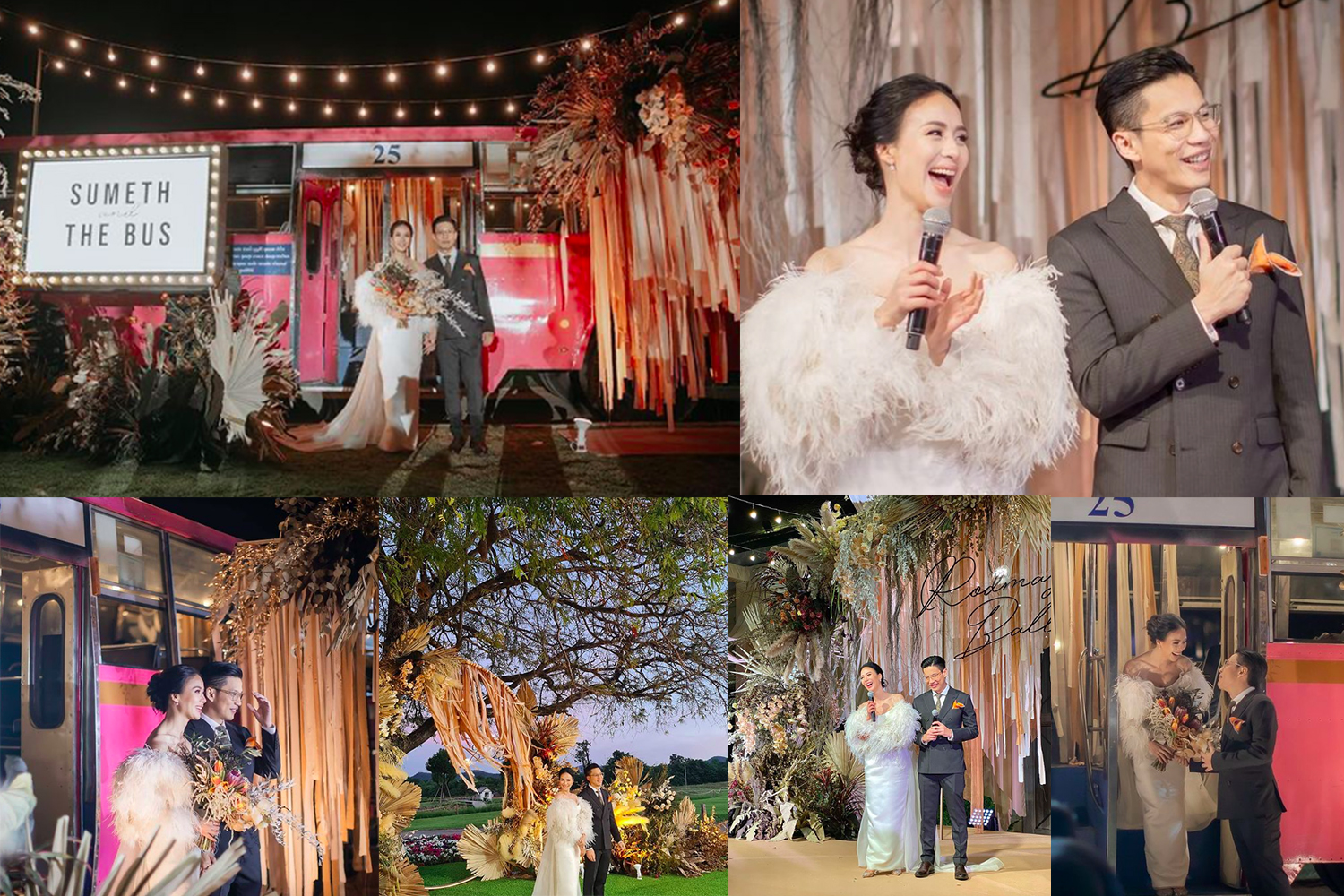 สำหรับบรรยากาศภายในงานก็มีทั้งครอบครัว เพื่อนทั้งในและนอกวงการต่างเดินทางมาร่วมแสดงความยินดีกับทั้งคู่ เรียกว่าเป็นงานปาร์ตี้ฉลองแต่งงานที่น่ารักและอบอุ่นมาก แถมแขกในงานทุกคนก็ต่างพากันมาถ่ายรูปกับมุมเก๋ๆ ที่มีรถเมล์สาย 25 มาจอดอยู่ในงานจริงๆ เรียกว่าตรงตามคอนเซ็ปต์ #sumethandthebus จริงๆ
