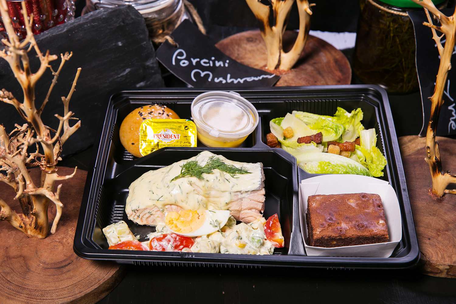 เซ็ตที่ 6 ปลาแซลมอนและซอสมัสตาร์ดผักชีดิล เสิร์ฟพร้อมซีซาร์สลัด และสลัดสไตล์รัสเซีย ช็อกโกแลตบราวนี่ ซอฟเบรดโรลเสิร์ฟพร้อมเนย