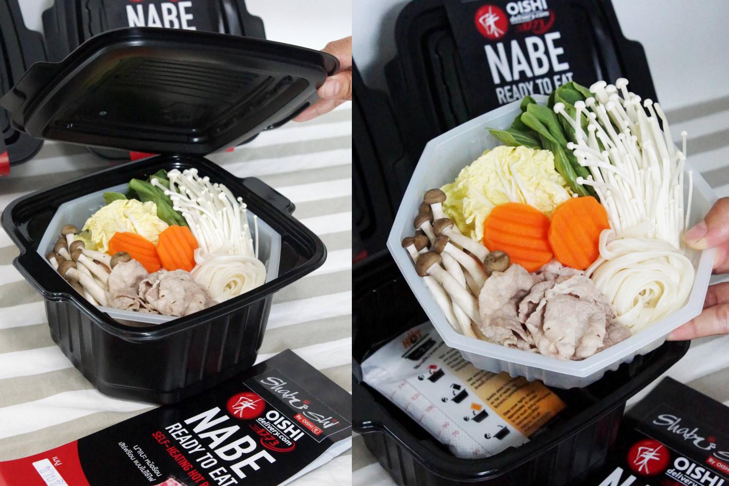 สำหรับเมนู NABE Self-Heating Hot Pot โออิชิต่อยอดสร้างความต่างจากเมนูอาหารญี่ปุ่นยอดนิยมตลอดกาลอย่างนาบะ และสุกี้ยากี้ น้ำซุปน้ำดำ ที่มีให้เลือกครบทั้งเนื้อหมู-เนื้อวัว-ซีฟู้ด ภายใต้แบรนด์ร้านอาหารญี่ปุ่นในเครือโออิชิ ได้แก่ โออิชิ อีทเทอเรียม, ชาบูชิ, โออิชิ ราเมน, และโออิชิ คิทเช่น สนนราคาเริ่มต้นที่ถ้วยละ 199 บาท