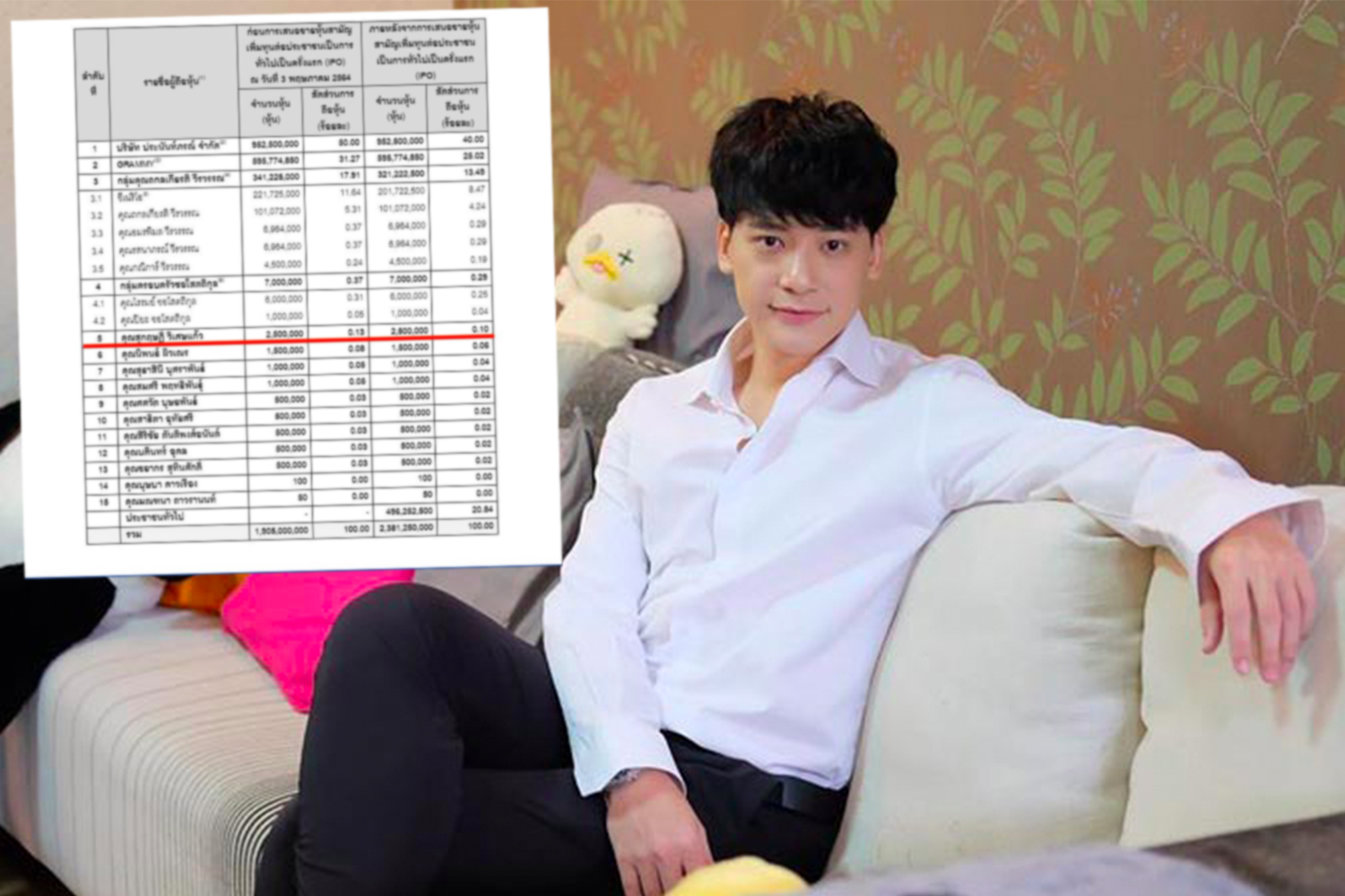 ล่าสุดทางเฟซบุ๊ก เจ๊มอย 108 ได้ออกมาเผยว่าหนุ่ม “บี้” นั้นได้ถือหุ้นกับช่อง ONE31 เป็นลำดับที่ 5 จำนวน 2,500,000 หุ้น นอกเหนือจากกลุ่มปราสาททองโอสถ-แกรมมี่ และครอบครัวถกลเกียรติ วีรวรรณ ซึ่งถือเป็นดารา-นักร้องคนเดียวที่ได้ถือหุ้นช่องวันเลยก็ว่าได้ ซึ่งก็ทำเอาหลายคนตกใจ เพราะเจ้าตัวไม่เคยออกมาอวดเลยสักครั้งและยังไม่ใช้ชีวิตหวือหวาด้วย
