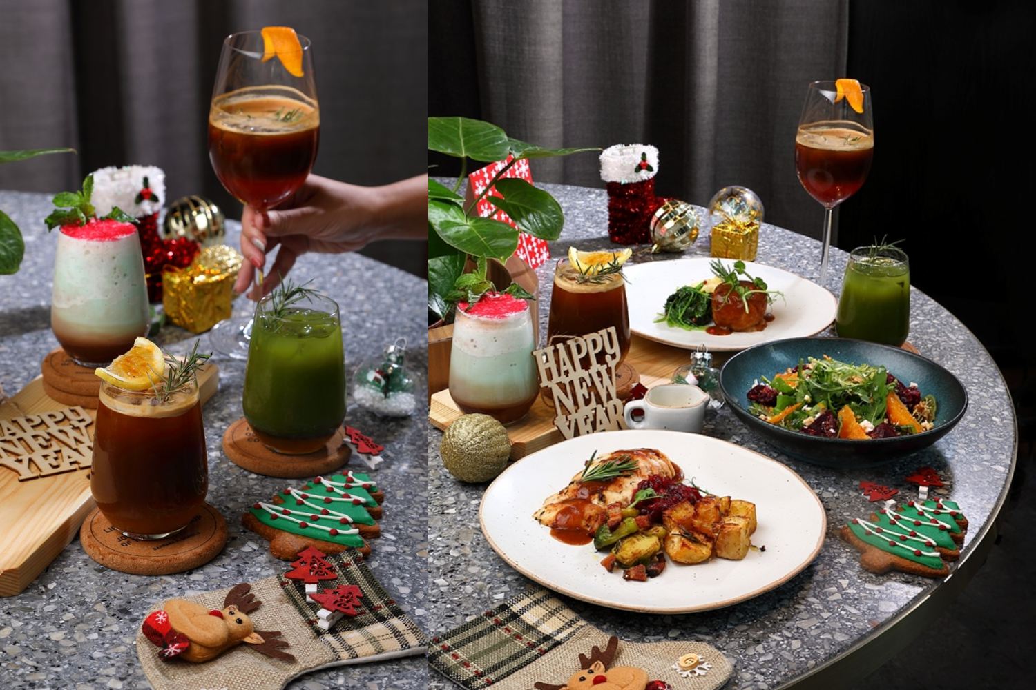 สำหรับเมนูขนมหวาน พลาดไม่ได้กับ “Christmas Log Cake” (180 บาท) เค้กรูปทรงขอนไม้ที่รังสรรค์มาสำหรับเทศกาลแห่งความสุขโดยเฉพาะ โดยมีให้เลือก 3 รสชาติ คือ มัทฉะ สตรอว์เบอร์รี่ และช็อกโกแลต ด้านเมนูเครื่องดื่ม ขอแนะนำ “Yuzu Long Black” (220 บาท) ที่มีส่วนผสมของช็อตเอสเพรสโซ่จากเฮาส์เบลนด์ ยูซุ และโซดา เพิ่มความหอมสดชื่นด้วยโรสแมรี่และเปลือกส้ม “Citrus Matcha” (220 บาท) เอาใจคอชาเขียวด้วยเครื่องดื่มสีสันสดใสจากมัทฉะ ยูซุ และโซดา ตกแต่งด้วยเชอร์รี่และโรสแมรี่ ต่อด้วยเครื่องดื่มที่สาวกช็อกโกแลตต้องลองกับ “Fancy Chocolate” (220 บาท) การผสมผสานของดาร์คช็อกโกแลต 75% กับไซรัปมินท์ที่หอมเย็นสดชื่น โรยด้วยผงสตรอว์เบอร์รี่ และตกแต่งด้วยใบสะระแหน่ และปิดท้ายกับ “Pink lady” (220 บาท) ความกลมกล่อมลงตัวของช็อตเอสเพรสโซ่จากเฮาส์เบลนด์ น้ำเกรปฟรุ๊ต และโซดา ตกแต่งด้วยเลม่อนและโรสแมรี่