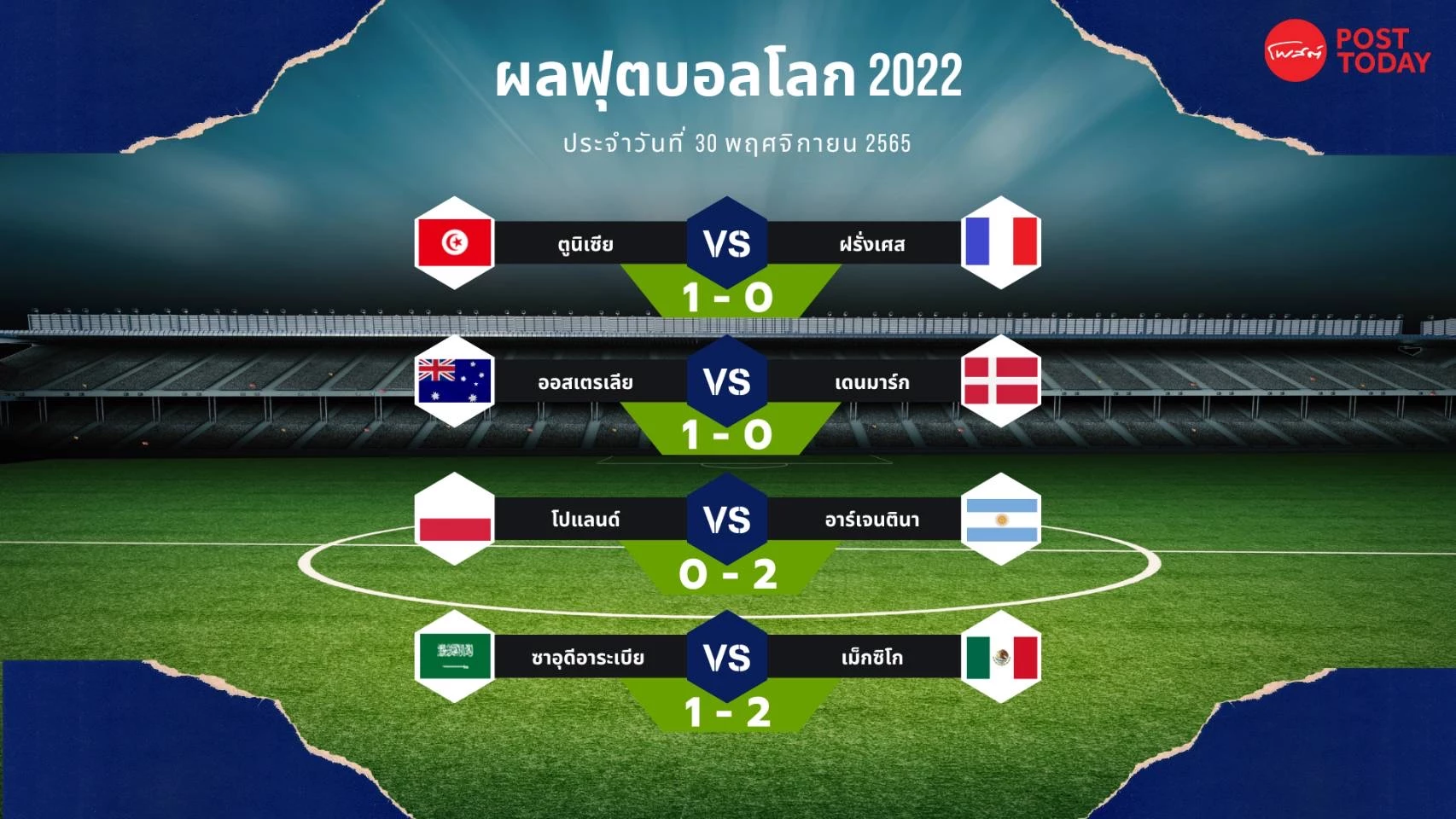 ฟุตบอลโลก 2022 ที่ประเทศกาตาร์ วันที่ 29 พฤศจิกายน 2565 ตูนิเซีย ชนะ ฝรั่งเศส 1-0 ออสเตรเลีย ชนะ เดนมาร์ก 1-0 อาร์เจนตินา ชนะ โปแลนด์ 2-0