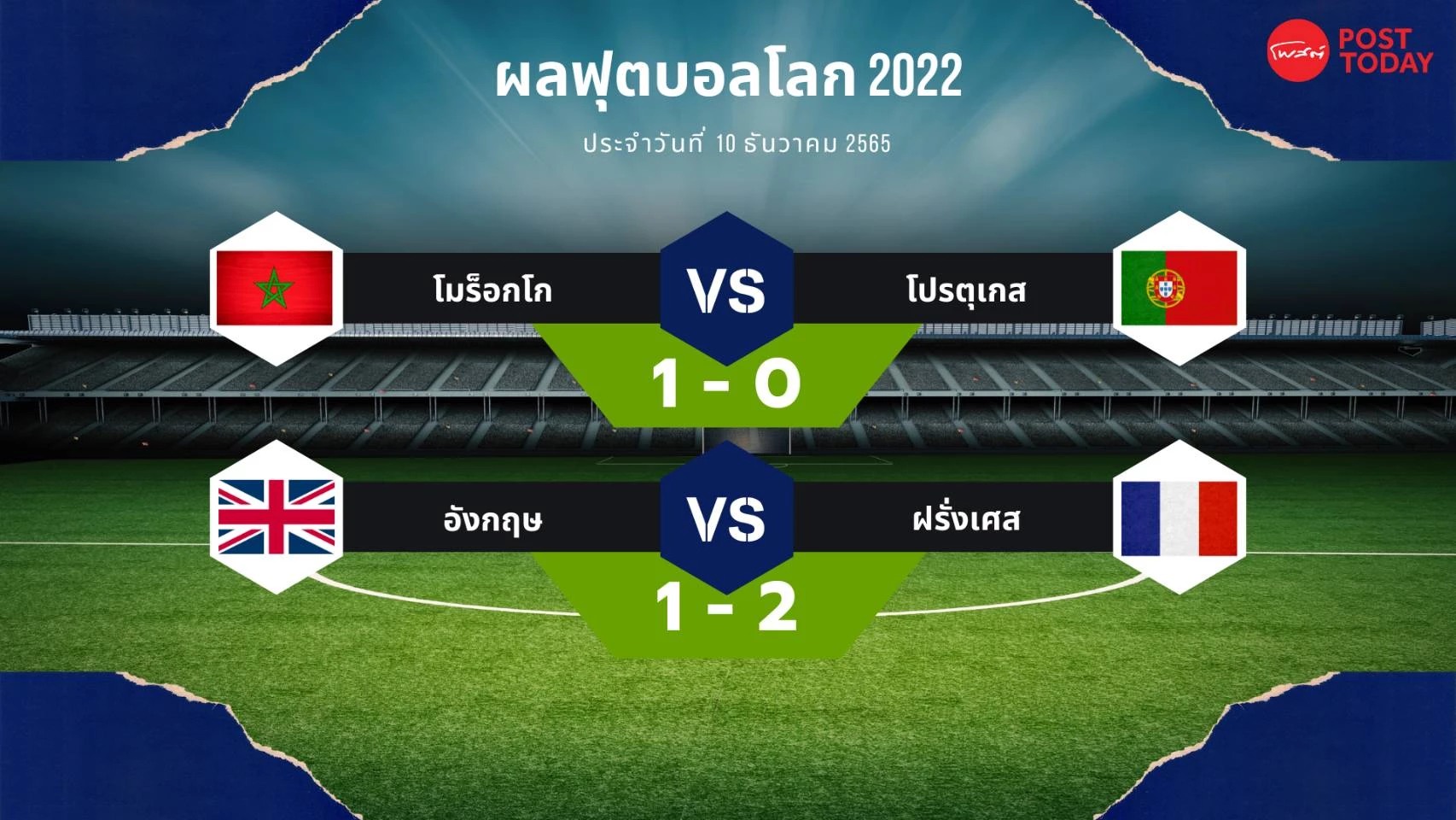 การแข่งขันฟุตบอลโลก 2022รอบ 8 ทีมสุดท้ายหรือรอบก่อนรองชนะเลิศ 10 ธันวาคม 2565 โมร็อกโก ชนะ โปรตุเกส 1 - 0 ฝรั่งเศส ชนะ อังกฤษ 2 - 1