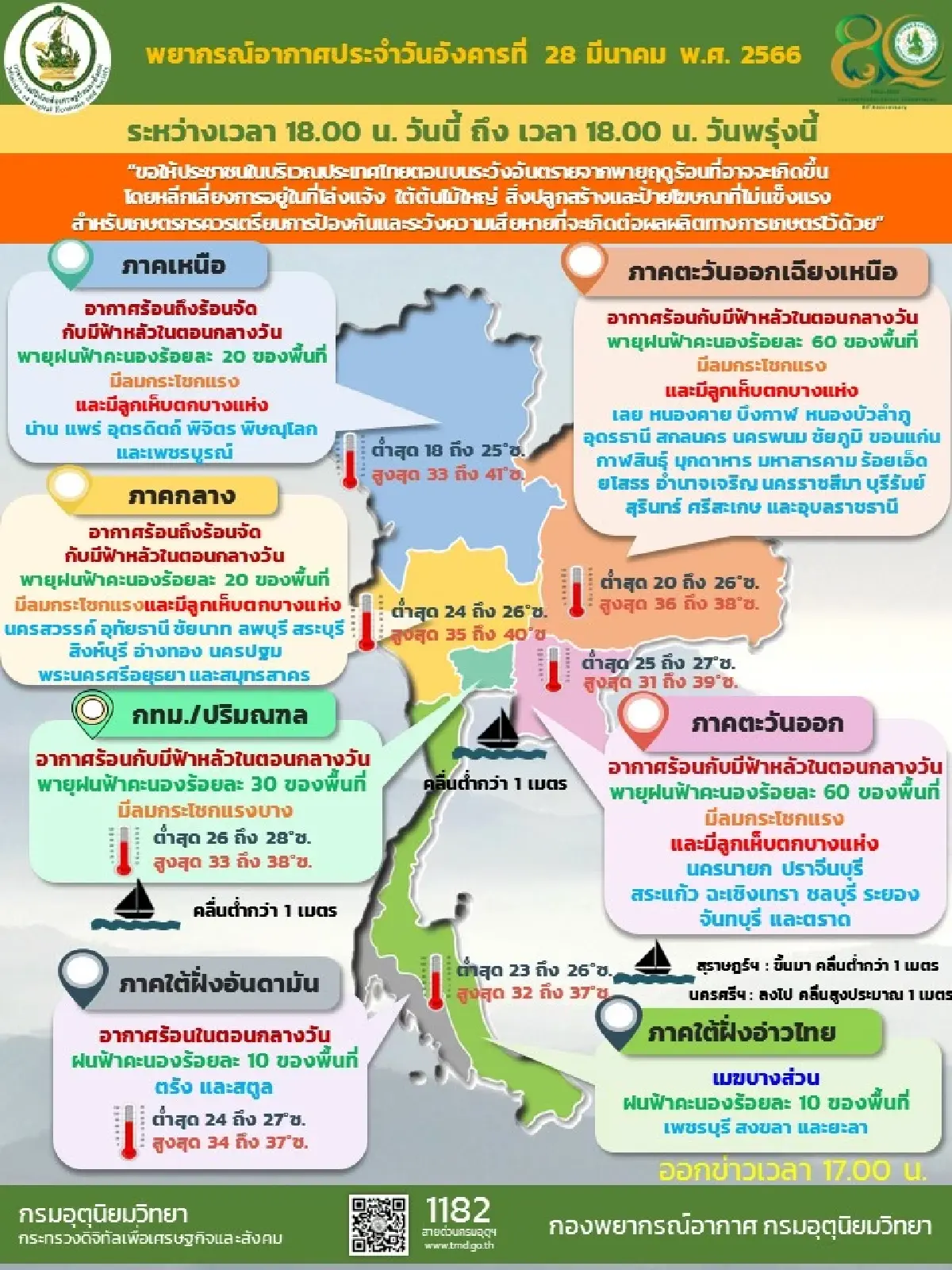 พยากรณ์อากาศ 24 ชั่วโมงข้างหน้า ความกดอากาศต่ำเนื่องจากความร้อนยังคงปกคลุมประเทศไทยตอนบนทำให้บริเวณดังกล่าวมีอากาศร้อนโดยทั่วไปกับมีฟ้าหลัวในตอนกลางวันและมีอากาศร้อนจัดบางพื้นที่ในภาคเหนือและภาคกลาง ในขณะที่บริเวณความกดอากาศสูงหรือมวลอากาศเย็นกำลังปานกลางจากประเทศจีนแผ่ปกคลุมภาคตะวันออกเฉียงเหนือและทะเลจีนใต้ ส่งผลทำให้มีลมใต้และลมตะวันออกเฉียงใต้พัดนำความชื้นจากอ่าวไทยและทะเลจีนใต้เข้ามาปกคลุมประเทศไทยตอนบน ลักษณะเช่นนี้ทำให้บริเวณดังกล่าวมีพายุฤดูร้อนเกิดขึ้น โดยมีลักษณะของพายุฝนฟ้าคะนอง ลมกระโชกแรง และมีลูกเห็บตกบางแห่ง จึงขอให้ประชาชนระวังอันตรายจากพายุฤดูร้อนที่อาจจะเกิดขึ้น โดยหลีกเลี่ยงการอยู่ในที่โล่งแจ้ง ใต้ต้นไม้ใหญ่ สิ่งปลูกสร้างและป้ายโฆษณาที่ไม่แข็งแรง สำหรับเกษตรกรควรเตรียมการป้องกันและระวังความเสียหายที่จะเกิดต่อผลผลิตทางการเกษตรไว้ด้วย