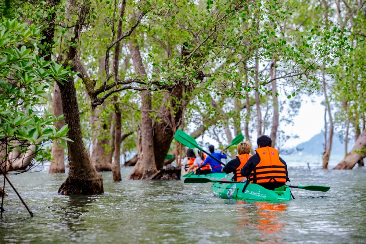 กิจกรรมจะเริ่มจากการปลูกป่าชายเลน ซึ่งระหว่างเดินไปยังพื้นที่นั้น ก็ได้เห็นป่าชายเลนผืนใหญ่ ที่ ‘เป็ด’ บอกว่าเป็นฝีมือชาวบ้านปลูกขึ้นมาใหม่ ซึ่งเติบโตขึ้นมาอย่างไม่น่าเชื่อ รวมถึงการพายคายัคผ่านแนวป่าชายเลนเพื่อเห็นวิวจากอ่าวทุ่งนุ้ยเต็มสายตา มีแนวชายหาดที่ผุดขึ้นกลางทะเลคล้ายสันหลังมังกรให้ได้แวะพักถ่ายรูป เมื่อมาถึงจุดหมายก็ได้มีโอกาสเห็นชาวบ้านที่ออกมาหาปลาตัวเล็กๆ ตามวิถีชาวบ้านดั้งเดิม