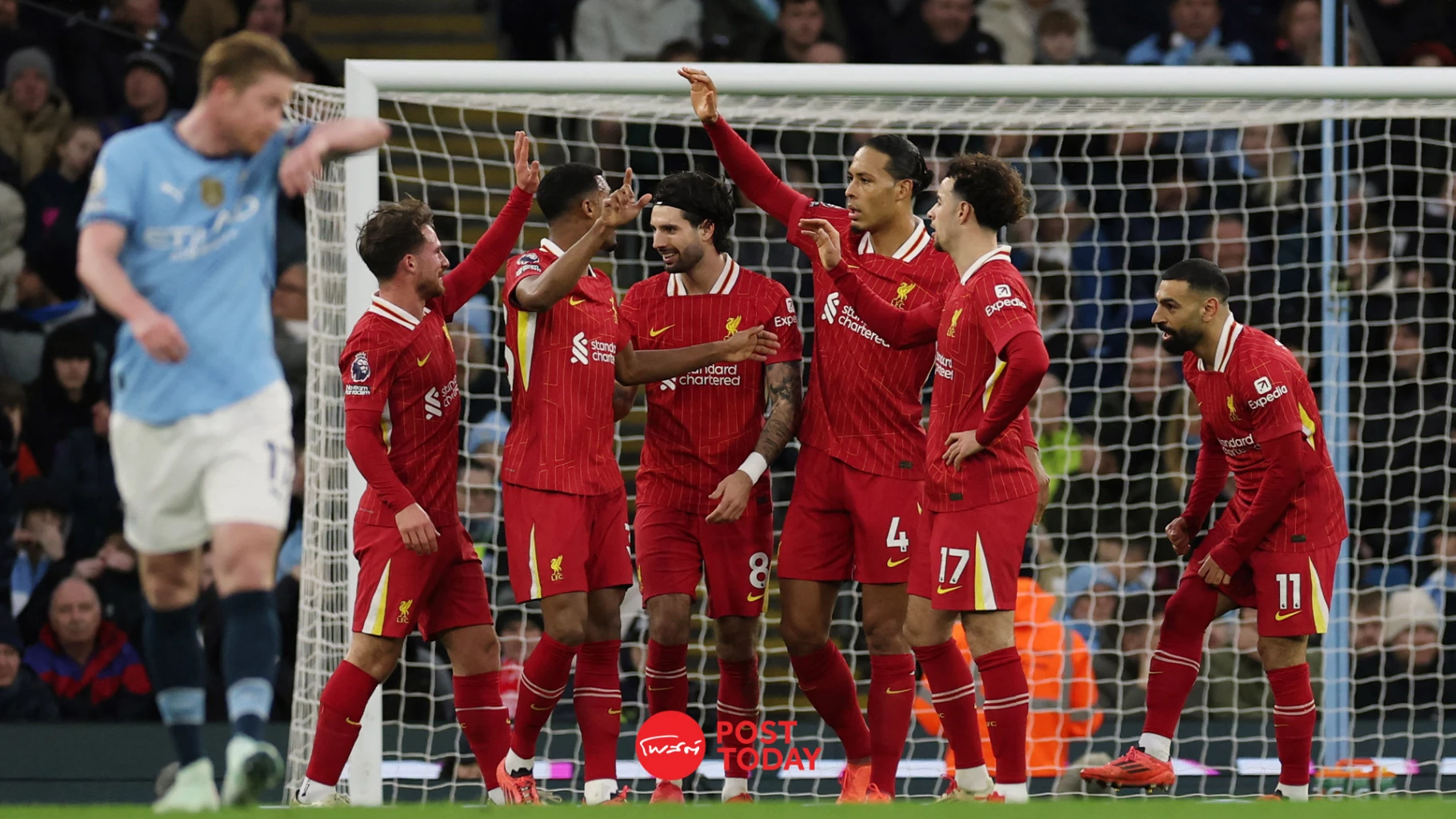 นาที 14 ลิเวอร์พูลขึ้นนำ 1-0 จากลูกสูตรเตะมุม อเล็กซิส แม็ค อัลลิสเตอร์ ส่งมาให้ โดมินิค โซบอสซ์ไล ก่อนจะวางมาที่ โมฮาเหม็ด ซาล่าห์ ซัดด้วยซ้ายบอลแฉลบ เจเรมี่ โดกู เปลี่ยนทางเข้าประตูไป ทำให้ ดาวยิงอียิตป์ ครองดาวซัลโว 25 ประตู และ 15 แอสซิสต์ในพรีเมียร์ลีกฤดูกาลนี้ และยังเป็นการยิงแมนซิตี้หนที่ 13 ในอาชีพของเจ้าตัวอีกด้วย