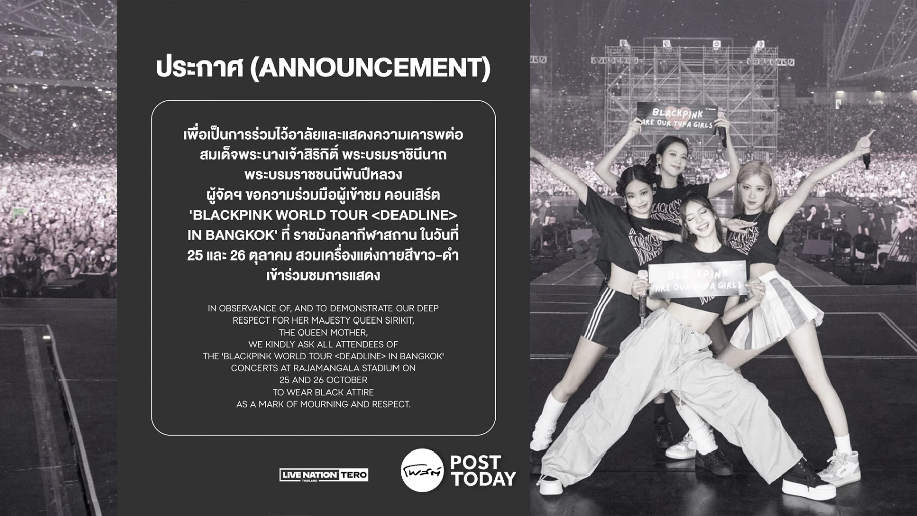 In observance of, and to demonstrate our deep respect for Her Majesty Queen Sirikit, The Queen Mother, we kindly ask all attendees of the 'BLACKPINK WORLD TOUR <DEADLINE> IN BANGKOK' concerts at Rajamangala Stadium on 25 and 26 October to wear black attire as a mark of mourning and respect.