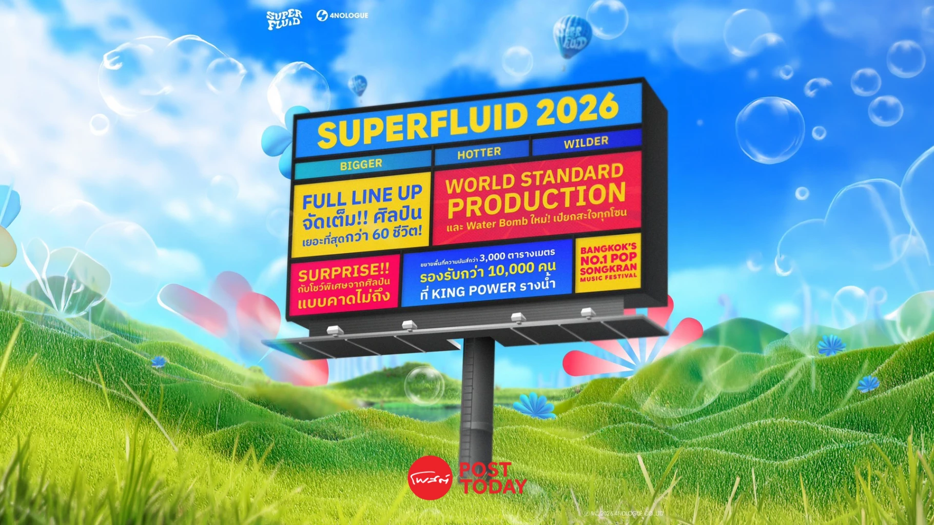 - 4NOLOGUE ร่วมมือกับ คิง เพาเวอร์ จัดงาน "SUPERFLUID 2026" เทศกาลดนตรีและสาดน้ำสงกรานต์รูปแบบใหม่ใจกลางรางน้ำ