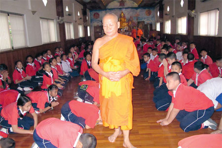 ก่อนที่จะเล่าเรื่องต่างๆ ที่แฝงคติธรรมและประวัติของวัด หลวงพ่อนำนักเรียนไหว้พระ สวดมนต์ และสมาทานศีล 5 ซึ่งนักเรียนทำได้สมบูรณ์ตามประเพณีชาวพุทธที่ดีได้เยี่ยมยอดมาก ทั้งๆ ที่เรียนซางตาครู้สอันเป็นโรงเรียนคริสต์