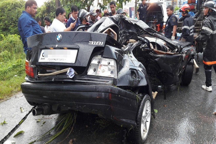 หนุ่มซิ่งรถหรู BMW เสียหลักพุ่งฟาดเสาไฟฟ้าตายสยองคาซากรถ