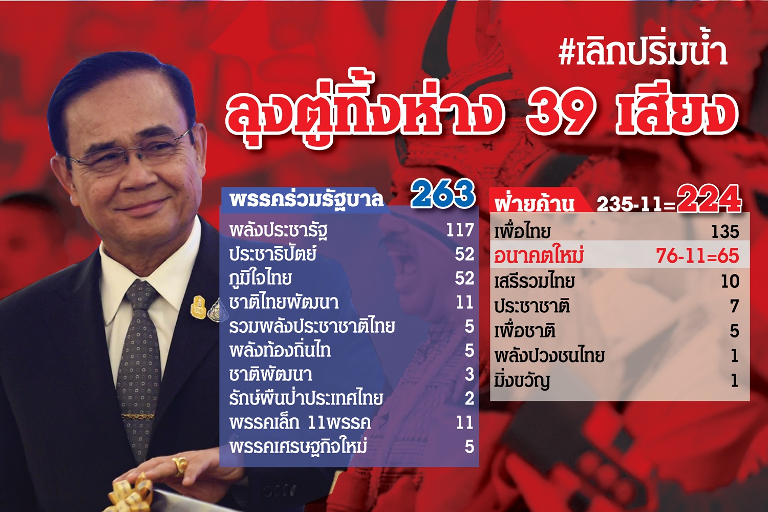 สำหรับเสียงฝ่ายค้าน 224 ที่นั่งซึ่งประกอบด้วย พรรคเพื่อไทย 135 อนาคตใหม่ 65 เสรีรวมไทย 10 ประชาชาติ 7 เพื่อชาติ 5 พลังปวงชนไทย 1 และนายมิ่งขวัญ แสงสุวรรณ์ ส.ส.พรรคเศรษฐกิจ ที่ยังประกาศอยู่กับทางพรรคฝ่ายค้าน