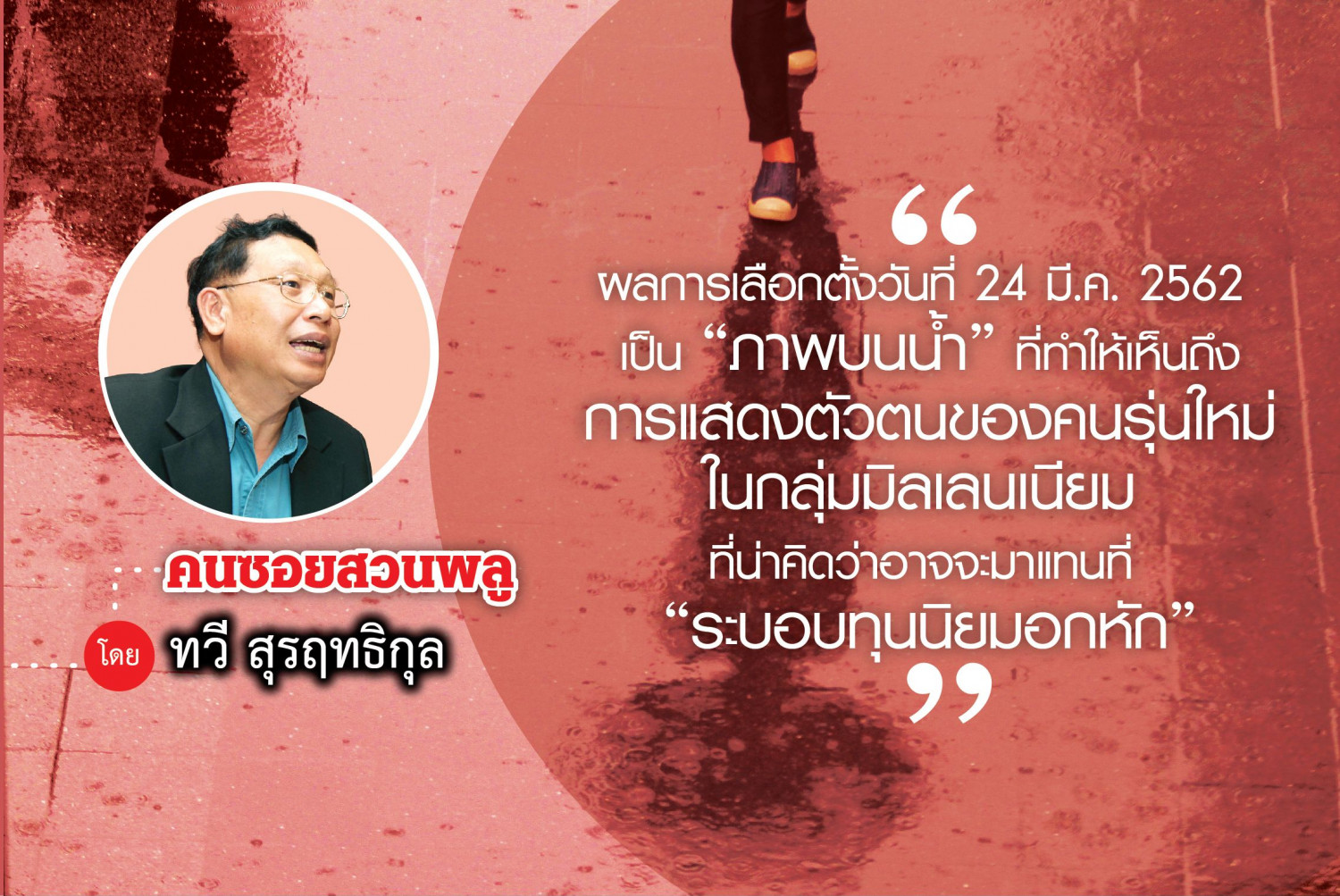 ผลการเลือกตั้งวันที่ 24 มีนาคม 2562 เป็น "ภาพบนน้ำ" ที่ทำให้เห็นถึงการแสดงตัวตนของคนรุ่นใหม่ในกลุ่มมิลเลนเนียม ที่น่าคิดว่าอาจจะมาแทนที่ "ระบอบทุนนิยมอกหัก" (หรือที่ฝ่ายตรงข้ามเรียกว่า "ทุนนิยมสามานย์") ที่มีแนวคิดในการโค่นล้ม "สถาบันเก่าๆ"ซึ่งนักสังเกตการณ์ทางการเมืองเก่าๆ บางคนอาจจะมองว่า คนทั้งสองกลุ่มกำลัง "ประสานประโยชน์" หรือเดินหน้าไปในหนทางเดียวกัน