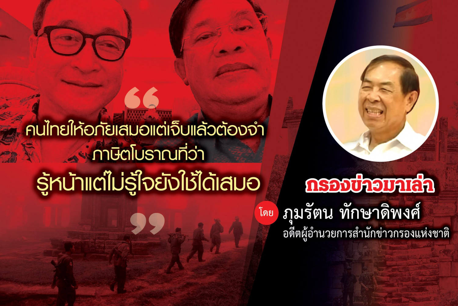 ที่เขียนเรื่องนี้ไม่ใช่การฟื้นฝอยหาตะเข็บตามที่โบราณพูดกัน คนไทยให้อภัยเสมอแต่เจ็บแล้วต้องจำ ภาษิตโบราณที่ว่ารู้หน้าแต่ไม่รู้ใจยังใช้ได้เสมอ ความจริงก็น่าเห็นใจผู้นำกัมพูชาเพราะข้อตกลงลับแบ่งปันผลประโยชน์ในอ่าวไทยนั้นมหาศาล อีกทั้งมีนักการเมืองไทยไปกราบไหว้อย่างอ่อนน้อม ซ้ำยังเอาพระสยามเทวาธิราชองค์จำลองไปมอบให้ ยอมให้กัมพูชาประกาศเขาพระวิหารเป็นมรดกโลกแต่ฝ่ายเดียว ฮุนเซนก็ต้องช่วยกันจนสุดฤทธิ์ จนกระทั่งมาเจอคนจริงเช่นนายกรัฐมนตรีไทยคนปัจจุบันที่รู้ฤทธิ์เดชกันมาแล้ว เราหวังว่า ตั้งแต่นี้ไป ผู้นำกัมพูชาจะยึดหลักการอาเซียนว่าด้วยการไม่แทรกแซงกิจการภายในอย่างเคร่งครัด