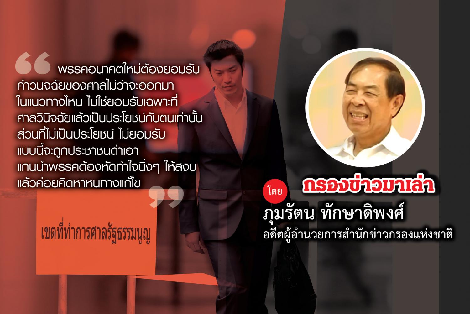 พรรคอนาคตใหม่ต้องยอมรับคำวินิจฉัยของศาล ไม่ว่าจะออกมาในแนวทางไหน ไม่ใช่ยอมรับเฉพาะที่ศาลวินิจฉัยแล้วเป็นประโยชน์กับตนเท่านั้น ส่วนที่ไม่เป็นประโยชน์ ไม่ยอมรับ แบบนี้จะถูกประชาชนด่าเอา แกนนำพรรคต้องหัดทำใจนิ่งๆ ให้สงบ แล้วค่อยคิดหาหนทางแก้ไข นี่เป็นเพียงคดีต้น ๆ เท่านั้น เพราะแกนนำพรรคบางรายยังมีคดีรออยู่อีกเป็นสิบคดี ถ้าไปวุ่นวายกล่าวหาศาล ประชาชนที่รักความเป็นธรรมเขาจะออกมาปกป้องศาล เมื่อนั้นพรรคจะยิ่งเสียหายหนักเข้าไปอีก