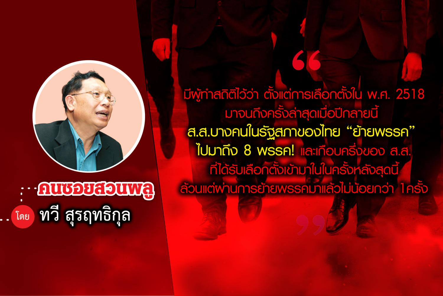 มีผู้ทำสถิติไว้ว่า ตั้งแต่การเลือกตั้งใน พ.ศ. 2518 มาจนถึงครั้งล่าสุดเมื่อปีกลายนี้ ส.ส.บางคนในรัฐสภาของไทย “ย้ายพรรค” ไปมาถึง 8 พรรค! และเกือบครึ่งของ ส.ส.ที่ได้รับเลือกตั้งเข้ามาในในครั้งหลังสุดนี้ล้วนแต่ผ่านการย้ายพรรคมาแล้วไม่น้อยกว่า 1 ครั้ง โดยมี ส.ส.ประมาณ 1 ใน 5 ของจำนวน ส.ส.เก่าที่เคยลงเลือกตั้งมามากกว่า 2 ครั้ง เคยย้ายพรรคมาเกินกว่า 2 พรรค!