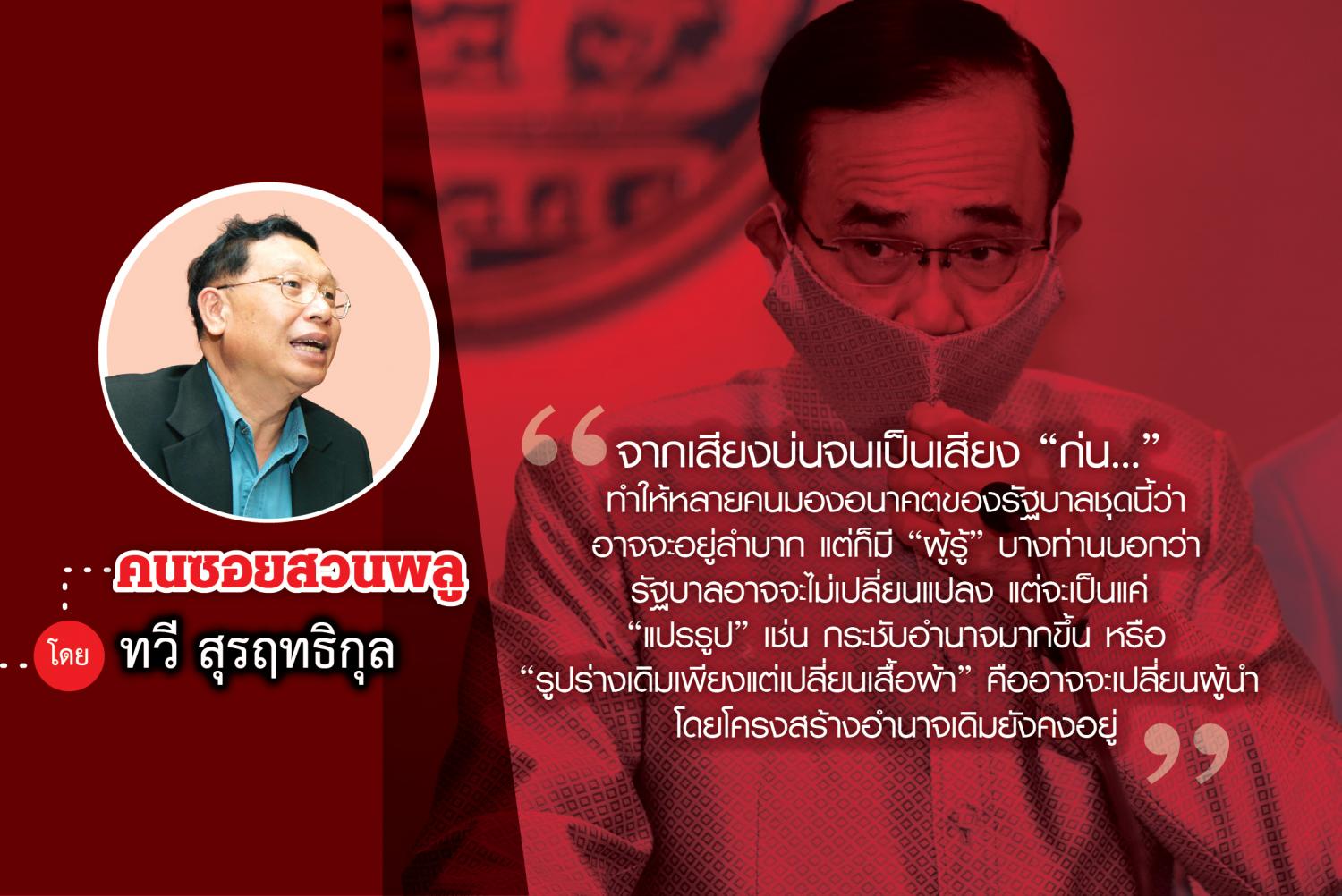 ทำให้หลายคนมองอนาคตของรัฐบาลชุดนี้ว่าอาจจะอยู่ลำบาก แต่ก็มี “ผู้รู้” บางท่านบอกว่า รัฐบาลอาจจะไม่เปลี่ยนแปลง แต่จะเป็นแค่ “แปรรูป” เช่น กระชับอำนาจมากขึ้น หรือ “รูปร่างเดิมเพียงแต่เปลี่ยนเสื้อผ้า” คืออาจจะเปลี่ยนผู้นำ โดยโครงสร้างอำนาจเดิมยังคงอยู่