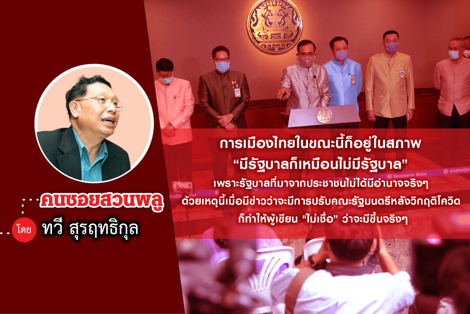 การเมืองไทยในขณะนี้ก็อยู่ในสภาพ “มีรัฐบาลก็เหมือนไม่มีรัฐบาล” เพราะรัฐบาลที่มาจากประชาชนไม่ได้มีอำนาจจริงๆ ด้วยเหตุนี้เมื่อมีข่าวว่าจะมีการปรับคณะรัฐมนตรีหลังวิกฤติโควิด ก็ทำให้ผู้เขียน "ไม่เชื่อ” ว่าจะมีขึ้นจริงๆ เพราะถ้าสภาพการณ์การเมืองไทยยังต้องอยู่ภายใต้การกำกับควบคุมของบางองค์กรอยู่เช่นนี้ และนักการเมืองที่มาจากการเลือกตั้งยังทำตัวเละเทะกันอยู่แบบนี้เดี๋ยว ที่สุดอาจไม่เหลือรัฐบาลให้ตั้งคณะรัฐมนตรีได้อีก