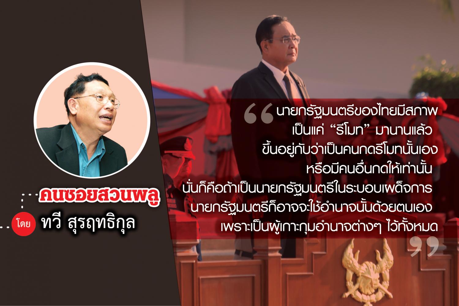 นายกรัฐมนตรีของไทยมีสภาพเป็นแค่ “รีโมท” มานานแล้ว ขึ้นอยู่กับว่าเป็นคนกดรีโมทนั้นเองหรือมีคนอื่นกดให้เท่านั้น นั่นก็คือถ้าเป็นนายกรัฐมนตรีในระบอบเผด็จการ นายกรัฐมนตรีก็อาจจะใช้อำนาจนั้นด้วยตนเอง เพราะเป็นผู้เกาะกุมอำนาจต่างๆ ไว้ทั้งหมด เช่น เป็นผู้บัญชาการทหารบกที่ควบคุมกองทัพและระบบราชการต่างๆ ได้ทั้งหมด แต่ในเผด็จการบางยุคนายกรัฐมนตรีอาจจะเป็นแค่ “หุ่นเชิด” เช่น ทหารแต่งตั้งให้เป็น ก็อาจจะถูกควบคุมไว้ด้วยกองทัพนั้นอีกที การทำงานต่างๆ ก็จะมีทหารมากดปุ่มรีโมทให้