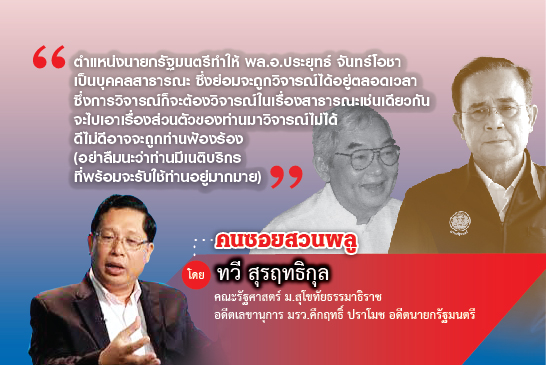 ตำแหน่งนายกรัฐมนตรีทำให้ พล.อ.ประยุทธ์ จันทร์โอชา เป็นบุคคลสาธารณะ ซึ่งย่อมจะถูกวิจารณ์ได้อยู่ตลอดเวลา ซึ่งการวิจารณ์ก็จะต้องวิจารณ์ในเรื่องสาธารณะเช่นเดียวกัน จะไปเอาเรื่องส่วนตัวของท่านมาวิจารณ์ไม่ได้ ดีไม่ดีอาจจะถูกท่านฟ้องร้อง (อย่าลืมนะว่าท่านมีเนติบริกรที่พร้อมจะรับใช้ท่านอยู่มากมาย) แต่ถ้าเป็นเรื่องสาธารณะอย่างดีก็แค่ “ทัวร์ลง” จากคนที่ชอบและปกป้องท่านเท่านั้นเอง