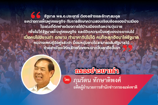 รัฐบาล พล.อ.ประยุทธ์ ต้องสร้างและรักษาสมดุลระหว่างการฟื้นฟูเศรษฐกิจ กับ การรักษาความสงบเรียบร้อยของบ้านเมือง ในขณะที่อีกฝ่ายต้องการให้บ้านเมืองเกิดความวุ่นวาย เพื่อไม่ให้รัฐบาลฟื้นฟูเศรษฐกิจ และชีวิตความเป็นอยู่ของประชาชนได้ เมื่อคนไม่มีงานทำ ตกงาน ทำมาหากินไม่ได้ คนก็จะลุกฮือมาไล่รัฐบาล คนวางแผนรู้ดีอยู่แล้ววว่า ม็อบหนุ่มสาวไม่สามารถล้มรัฐบาลได้ ทำอย่างไรจะให้คนไทยที่ตกงานมากขึ้นลุกฮือขึ้นมา