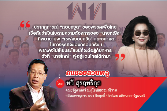 ปรากฏการณ์ “ถอยกรูด” ของพรรคเพื่อไทย เชื่อกันว่าเป็นไปตามความต้องการของ “นายหญิง” ที่พยายามจะ “เซฟครอบครัว” และอนาคตในทางธุรกิจของครอบครัว เพราะคงไม่เห็นประโยชน์ที่จะต่อสู้กับทหาร ดังที่ “นายใหญ่” ผู้อยู่แดนไกลได้ทำมา