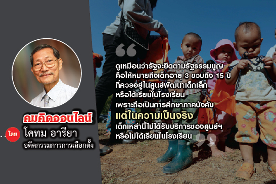 ดูเหมือนว่ารัฐจะยึดตามรัฐธรรมนูญ คือให้หมายถึงเด็กอายุ 3ขวบถึง 15 ปี ที่ควรอยู่ในศูนย์พัฒนาเด็กเล็ก หรือได้เรียนในโรงเรียน เพราะถือเป็นการศึกษาภาคบังคับ แต่ในความเป็นจริง เด็กเหล่านี้ไม่ได้รับบริการของศูนย์ฯ หรือไม่ได้เรียนในโรงเรียน ทั้งนี้แม้พ.ร.บ.การศึกษาภาคบังคับ พ.ศ. 2545 มาตรา 15 บัญญัติจะว่า"ผู้ใดโดยปราศจากเหตุผลอันควร กระทำด้วยประการใดๆ อันเป็นเหตุให้เด็กไม่ได้เรียนในสถานศึกษาตามพระราชบัญญัตินี้ ต้องระวางโทษปรับไม่เกินหนึ่งหมื่นบาท" แต่คงไม่มีการบังคับมากนัก หรือไม่บังคับเลย จึงไม่มีใครถูกปรับเพราะเป็นเหตุให้เกิดมีเด็กนอกระบบการศึกษาหรอกกระมัง