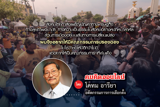 สังคมไทยกำลังเผชิญปัญหาทางเศรษฐกิจ ทางสุขภาพอนามัย ทางความเป็นธรรมในสังคมอย่างหนักหนาสาหัส ส่วนการเมืองอยู่บนเส้นทางการเปลี่ยนแปลง ผมจึงอยากให้มีคณะกรรมการปรองดอง ไม่ใช่ว่าขอให้มีดีกว่าไม่มี แต่อยากให้เป็นคณะกรรมการฯที่เข้มแข็ง อยากให้กรรมการแต่ละคนเอาจริงเอาจัง อยากให้สังคมให้ความไว้วางใจ อยากให้คณะกรรมการฯเป็นมโนสำนึกของสังคมได้ในระดับหนึ่ง ในยามที่สังคมเกิดความว้าเหว่เช่นนี้