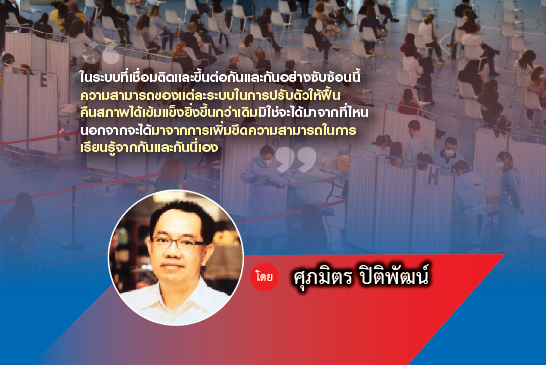 ในระบบที่เชื่อมติดและขึ้นต่อกันและกันอย่างซับซ้อนนี้ ความสามารถของแต่ละระบบในการปรับตัวให้ฟื้นคืนสภาพได้เข้มแข็งยิ่งขึ้นกว่าเดิมมิใช่จะได้มาจากที่ไหน นอกจากจะได้มาจากการเพิ่มขีดความสามารถในการเรียนรู้จากกันและกันนี่เอง