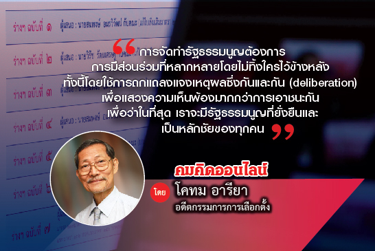 การจัดทำรัฐธรรมนูญต้องการการมีส่วนร่วมที่หลากหลายโดยไม่ทิ้งใครไว้ข้างหลัง ทั้งนี้โดยใช้การถกแถลงแจงเหตุผลซึ่งกันและกัน (deliberation) เพื่อแสวงความเห็นพ้องมากกว่าการเอาชนะกัน เพื่อว่าในที่สุด เราจะมีรัฐธรรมนูญที่ยั่งยืนและเป็นหลักชัยของทุกคน