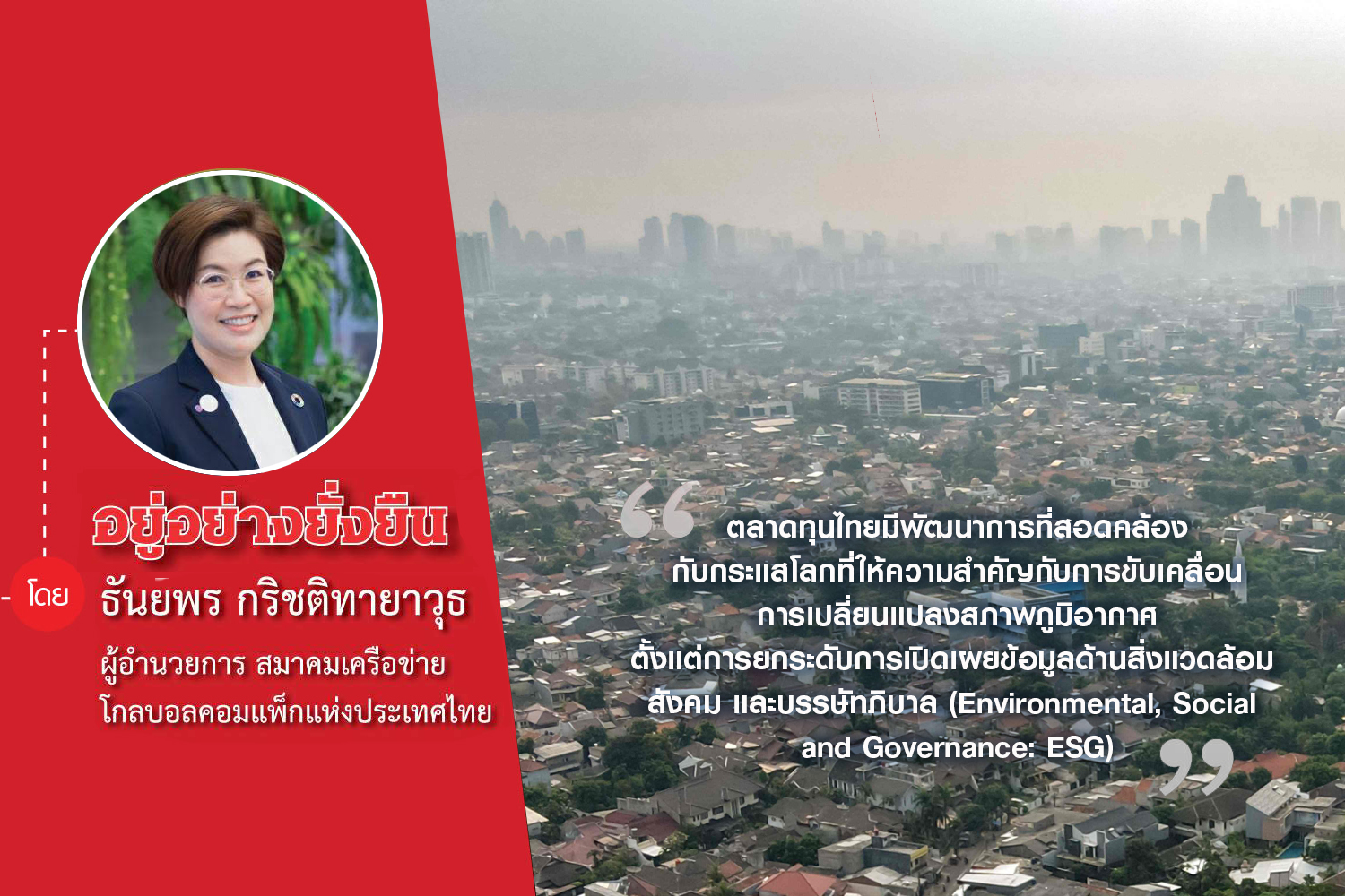 สอดคล้องกับที่ สํานักงานคณะกรรมการกํากับหลักทรัพย์และตลาดหลักทรัพย์ (ก.ล.ต.) ได้ประกาศการเข้าร่วมเป็นผู้สนับสนุนมาตรฐานการเปิดเผยข้อมูลทางการเงินที่เกี่ยวข้องกับสภาพภูมิอากาศ (TCFD supporter) อย่างเป็นทางการ  ถือเป็นก้าวสําคัญที่แสดงให้ผู้ลงทุนทั่วโลกเห็นว่า ตลาดทุนไทยมีพัฒนาการที่สอดคล้องกับกระแสโลกที่ให้ความสําคัญกับการขับเคลื่อนการเปลี่ยนแปลงสภาพภูมิอากาศ ตั้งแต่การยกระดับการเปิดเผยข้อมูลด้านสิ่งแวดล้อม สังคม และบรรษัทภิบาล (Environmental, Social and Governance: ESG) ของบริษัทจดทะเบียนในการเปิดเผยข้อมูลในแบบ 56-1 One Report โดยเฉพาะอย่างยิ่งข้อมูลเกี่ยวกับการปล่อยกาซเรือนกระจก ซึ่งถือเป็นพื้นฐาน ที่สําคัญในเสริมสร้างความสามารถของภาคธุรกิจให้บริหารจัดการกับความเสี่ยงที่มีนัยสําคัญ และโอกาสทางธุรกิจที่เกิดจากสภาพภูมิอากาศ